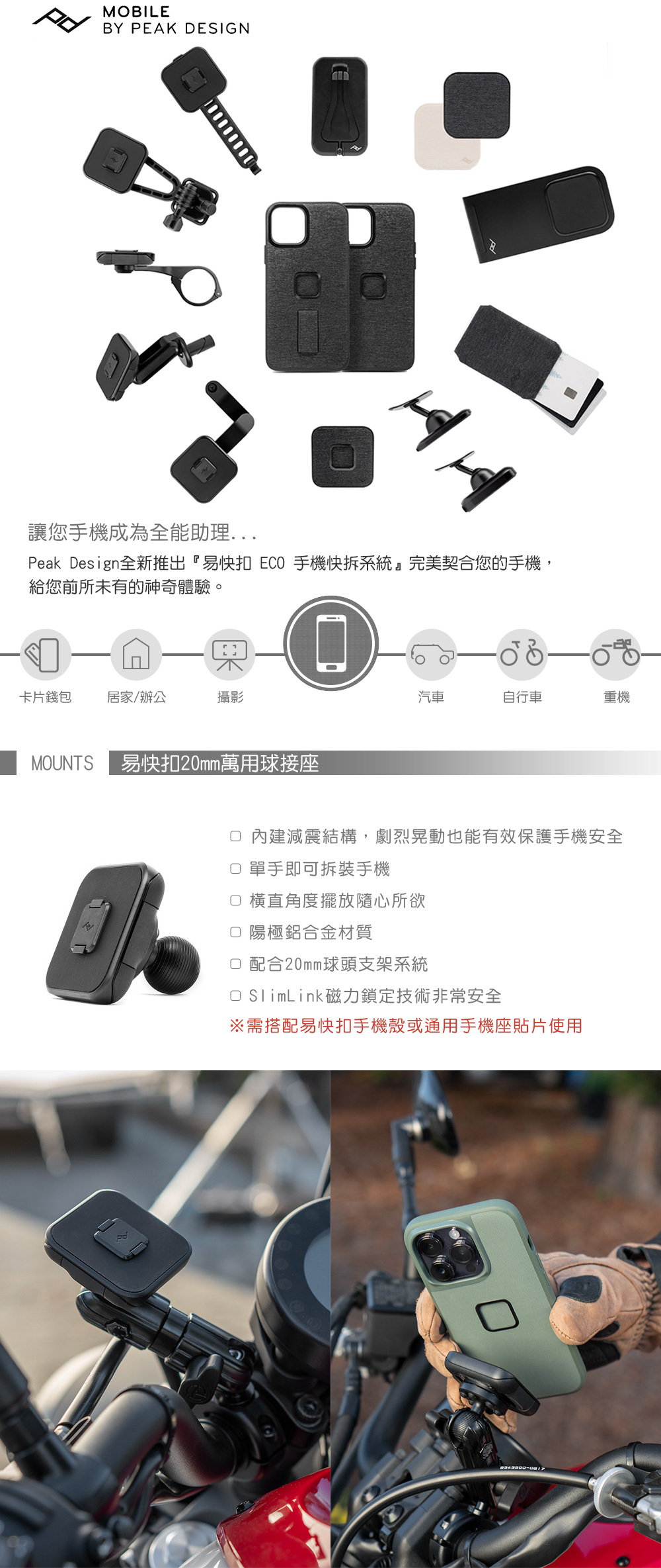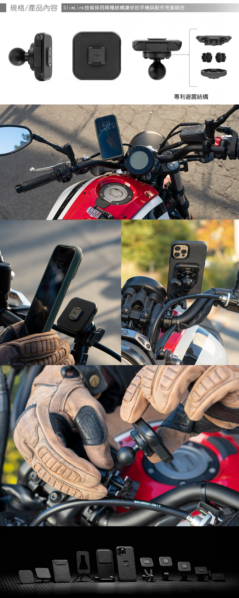 適用20mm球頭支架系統,任意搭配連接固定配件,內建減震結構,劇烈晃動也能有效保護手機安全,將手機牢牢固定在重機、汽車或後照鏡手把上,輕鬆調整角度方向,配有SlimLink高強度陶瓷快扣穩固定結構,橫直擺放隨心所欲,劇烈運動也不用擔心脫落。