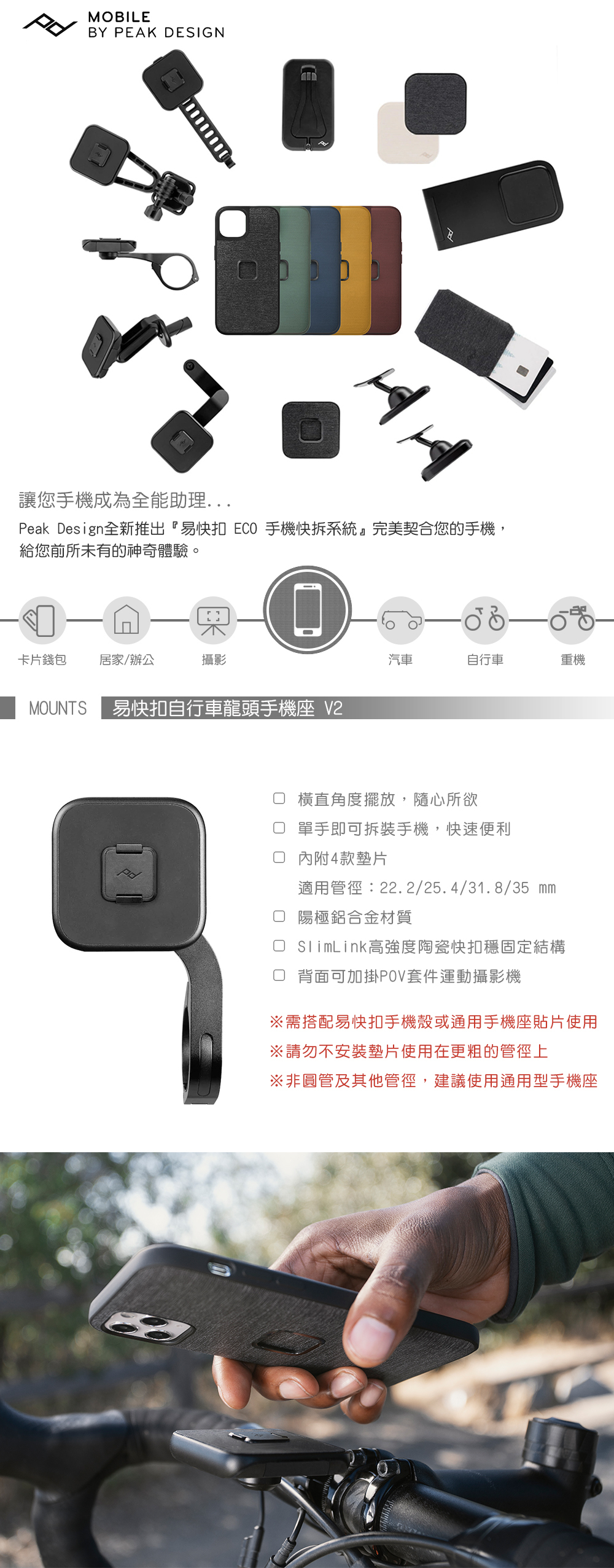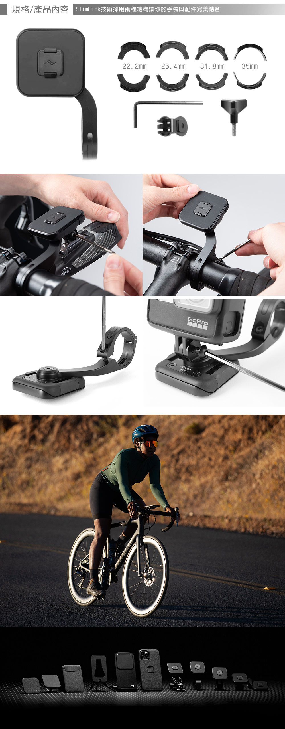 新升級!相容更大管徑,內附4款墊片適用管徑:22.2 / 25.4 / 31.8 / 35 mm。橫直擺放隨心所欲,劇烈運動也不用擔心脫落,且完全不干擾GPS等設備,背面可加掛POV套件運動攝影機,單手即可拆裝手機,SlimLink高強度陶瓷快扣穩固定結構。請勿不安裝墊片使用在更粗的管徑上,非圓管及其他管徑,建議使用通用型手機座。