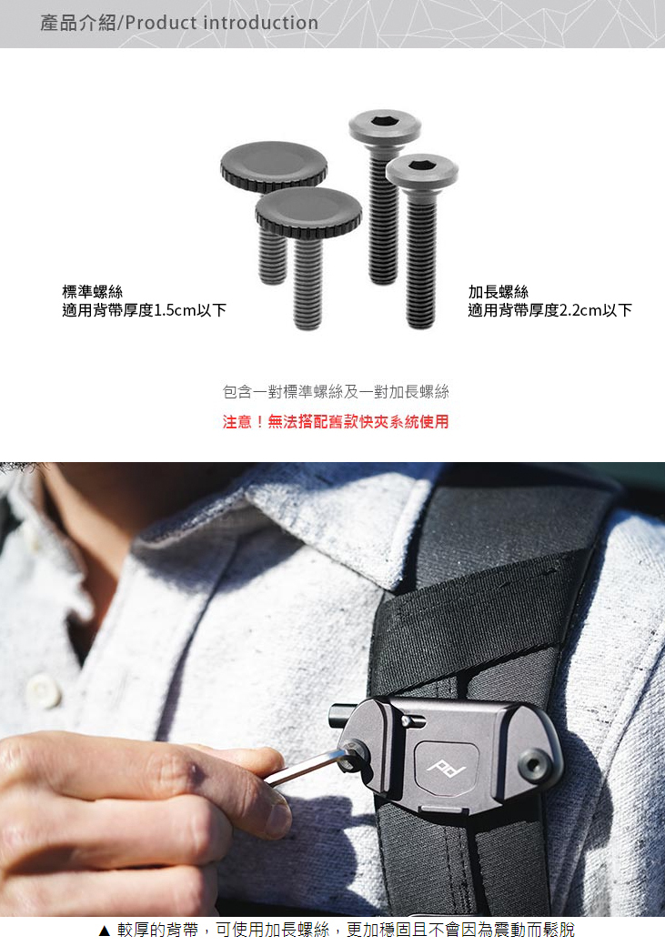加長螺絲可用六角板手鎖緊在背帶上,更加穩固且不會因為震動而鬆脫