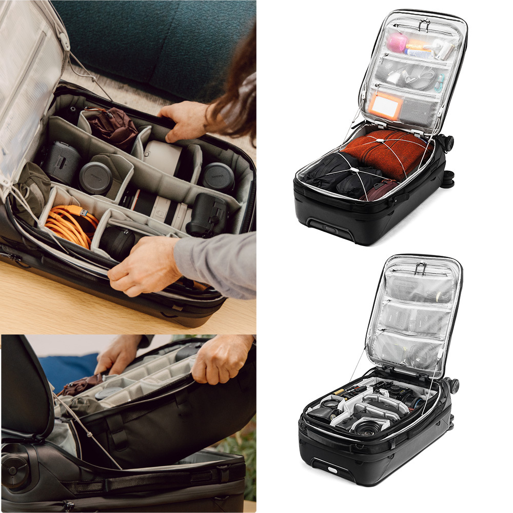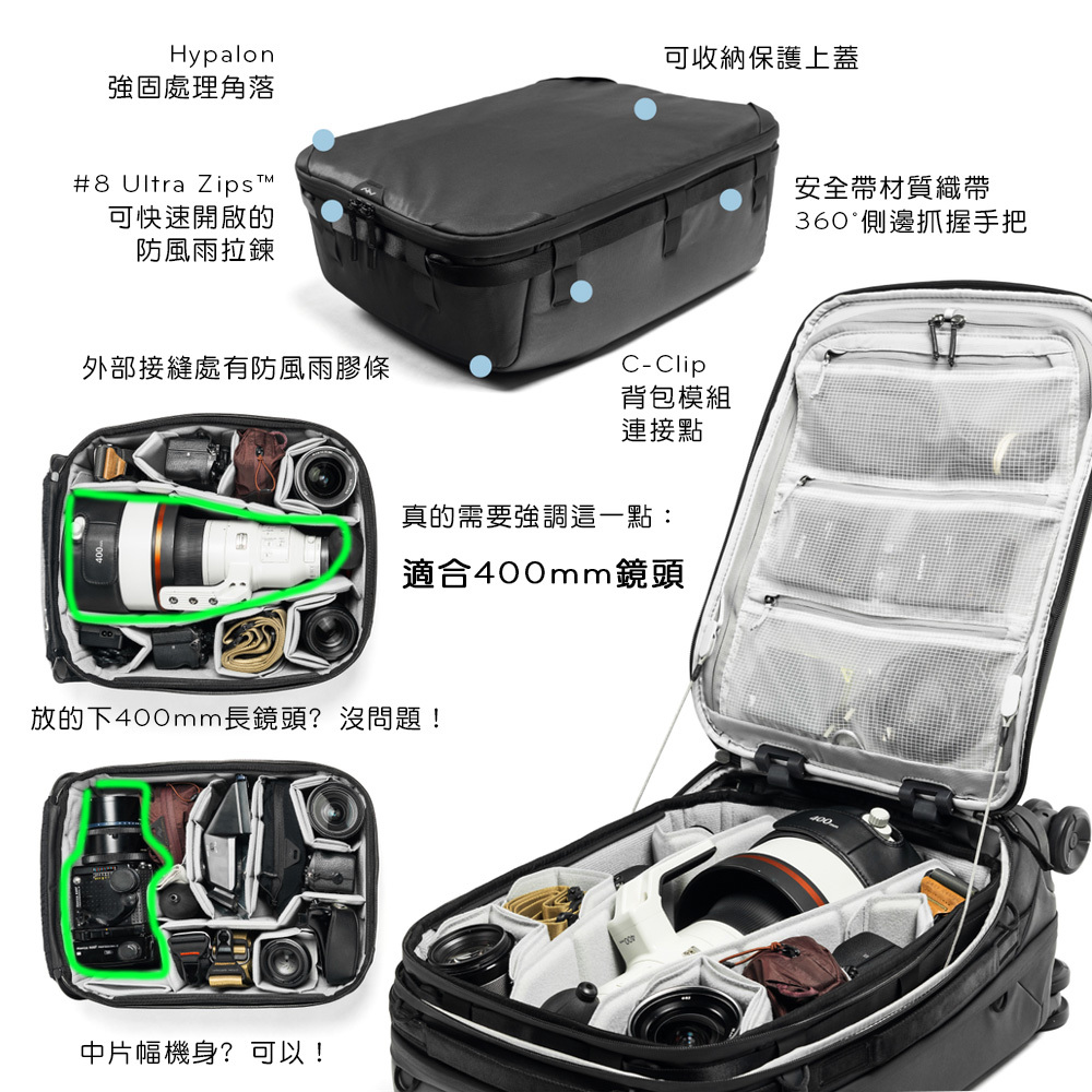 超大容量,完美相容Roller Pro易拉輪行李箱!超強保護且易於取用設備,攜帶相機、攝影機或無人機裝備外出不再痛苦和麻煩。無論是小型無反相機,還是全套專業單眼設備,都可為您提供模組化搭配和安全保護。3種尺寸的隔版,是市面上最能夠符合用戶自訂、分配空間的隔版系統。放入行李箱或背包使用時,折疊式上蓋可收納於側邊,提把設計方便整袋拿取。防風雨160D尼龍帆布,高密度EVA泡棉底襯,確保您的裝備安全,終身保修。(內尺寸:43.5 x 32.5 x 16 cm,外尺寸:45.5 x 34.5 x 18 cm,重量:1077g)