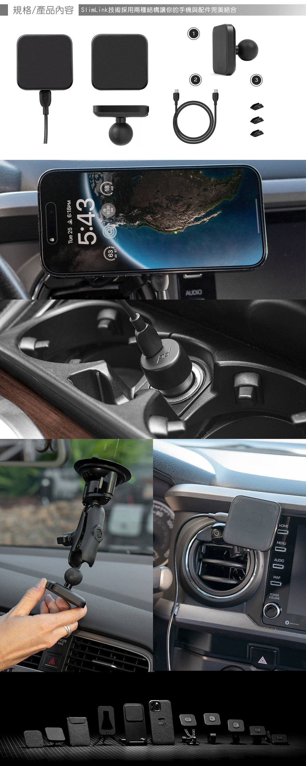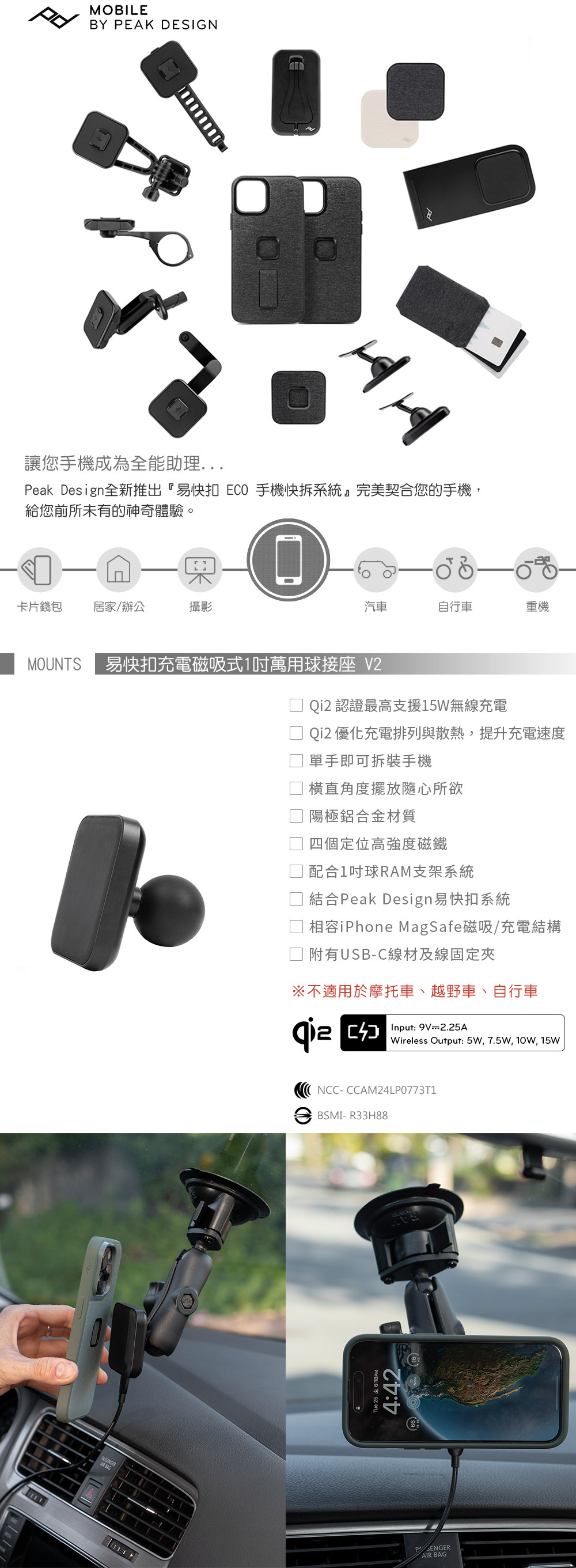 Qi2 認證最高支援15W無線充電,優化充電排列與散熱,提升充電速度。適用1吋球RAM支架系統,任意搭配連接固定配件,輕鬆調整角度方向,內建無線充電功能款附有USB-C線材,迷你的體積,卻提供強大的穩定度,四個定位高強度磁鐵,橡膠腳墊防滑設計,精密的萬向球頭,相容原廠iPhone MagSafe磁吸/充電結構。(僅磁吸固定,不適用於摩托車、越野車、自行車上)|NCC- CCAM24LP0773T1|BSMI- R33H88