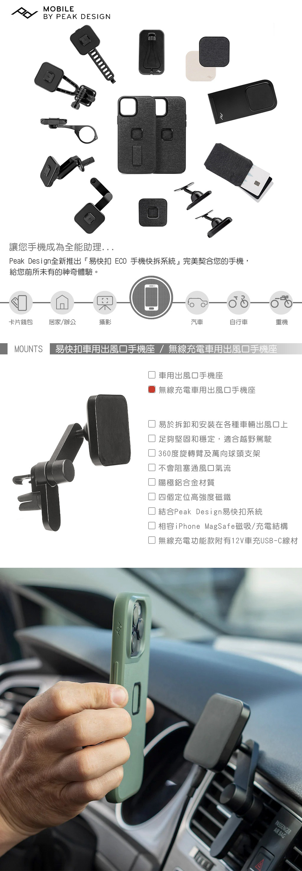 附有12V車充、USB-C線材,兩點固定出風口方式強化穩定不易晃動脫落,適合任何類型的駕駛,包括越野。磁吸安裝每次都能完美對齊,提供更高效的充電。可以縱向或橫向模式安裝手機。360 度旋轉臂讓您可以將手機放在您想要的位置,精密的萬向球頭,相容原廠iPhone MagSafe磁吸結構。