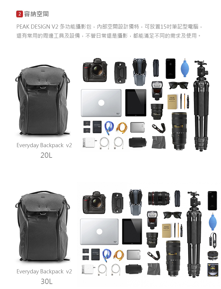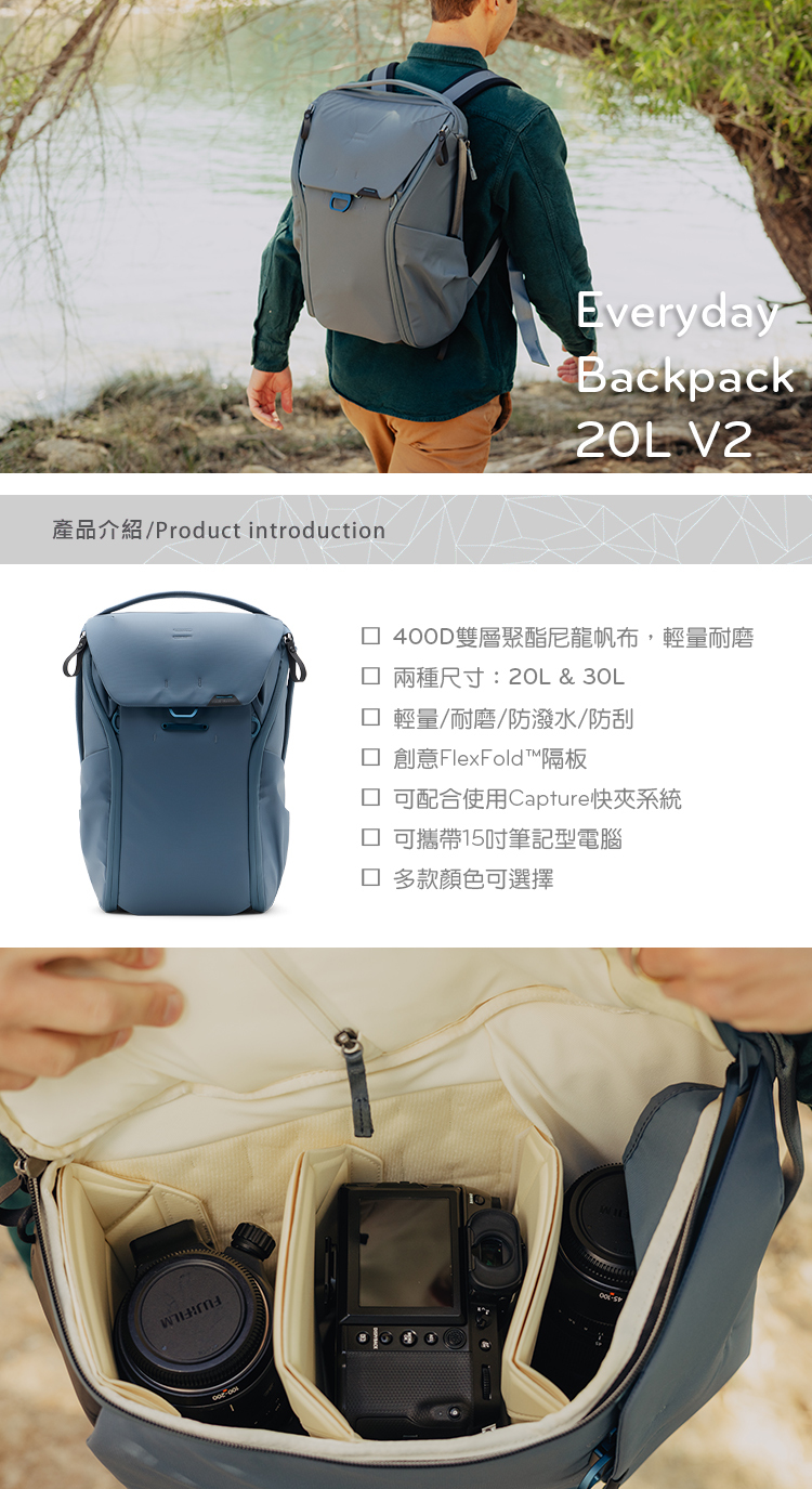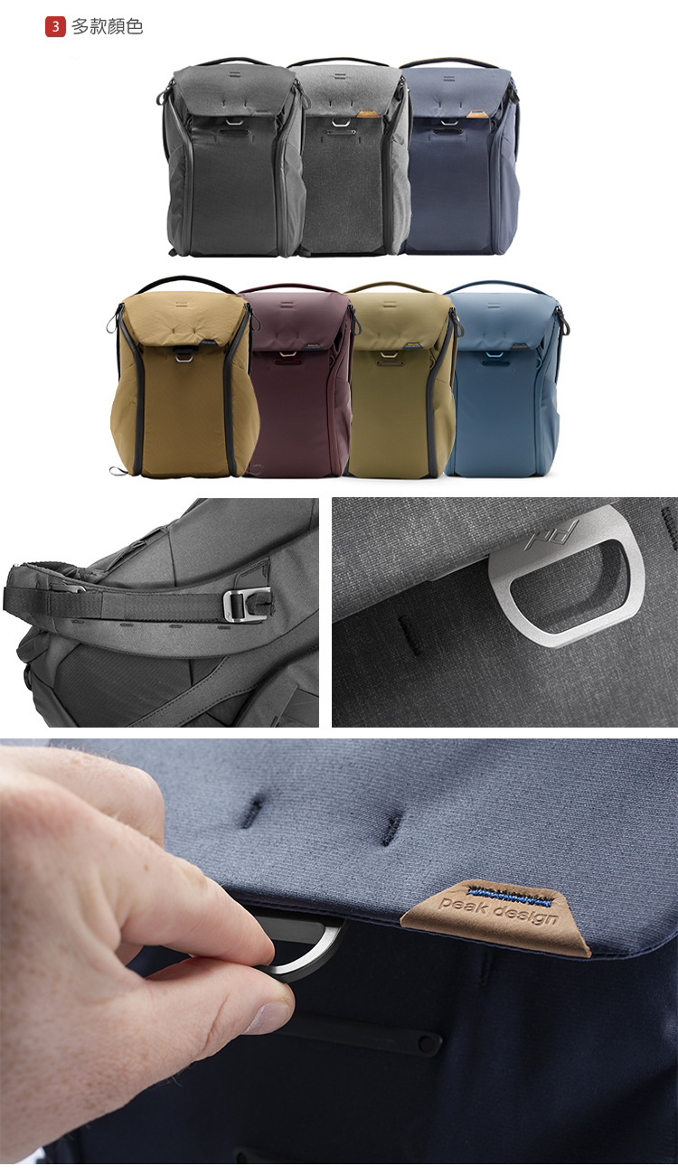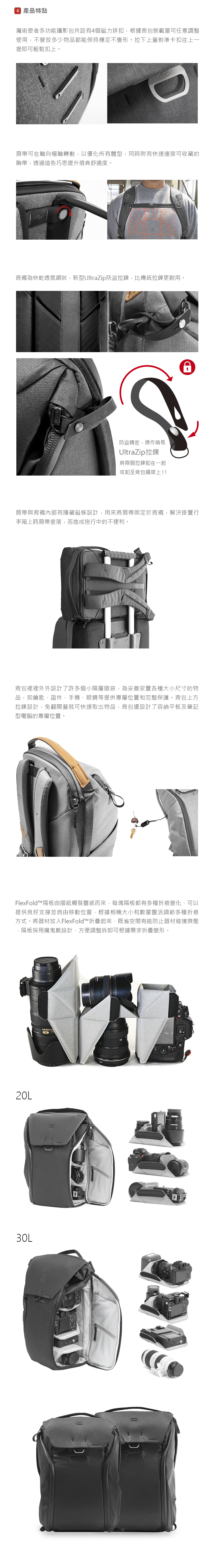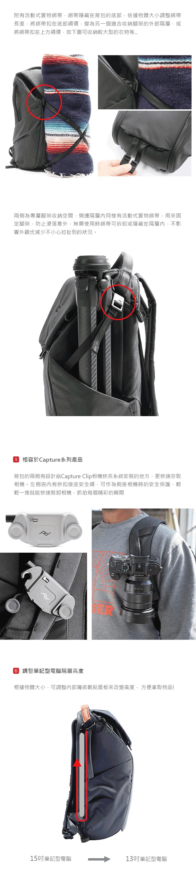 精簡輪廓設計。減少明顯的接縫,避免讓水或污物滲入背包,材質為100%可回收的400D尼龍,增強防潑水功能,與Zoom公司合作開發了專有的UltraZip新型拉鍊,側邊內置三腳架綁帶設計,也可任意調整筆記型電腦隔層高度 ,依然完美搭配Capture 相機快夾系統 。