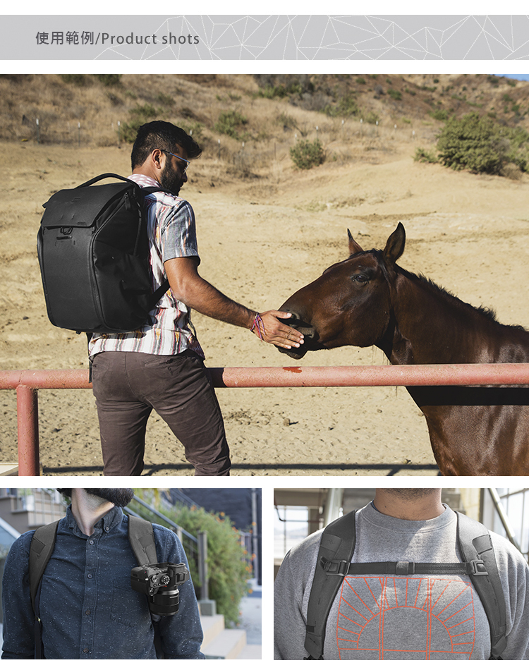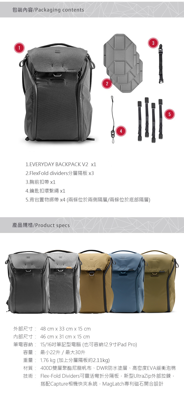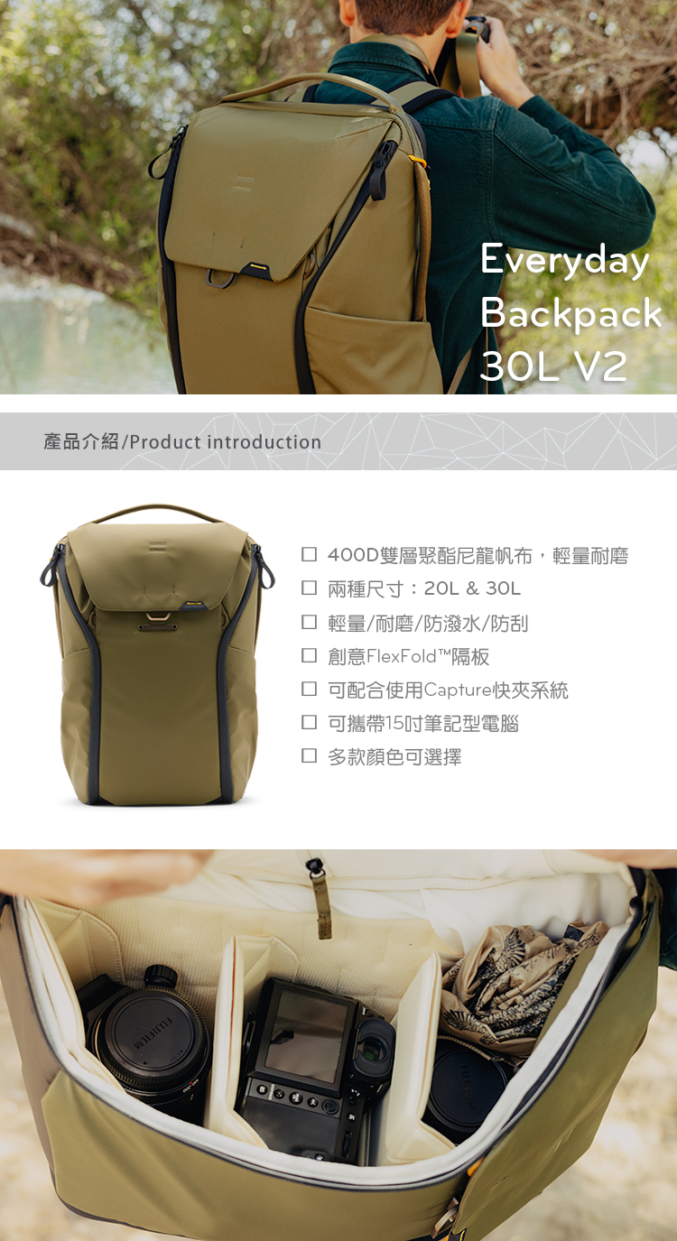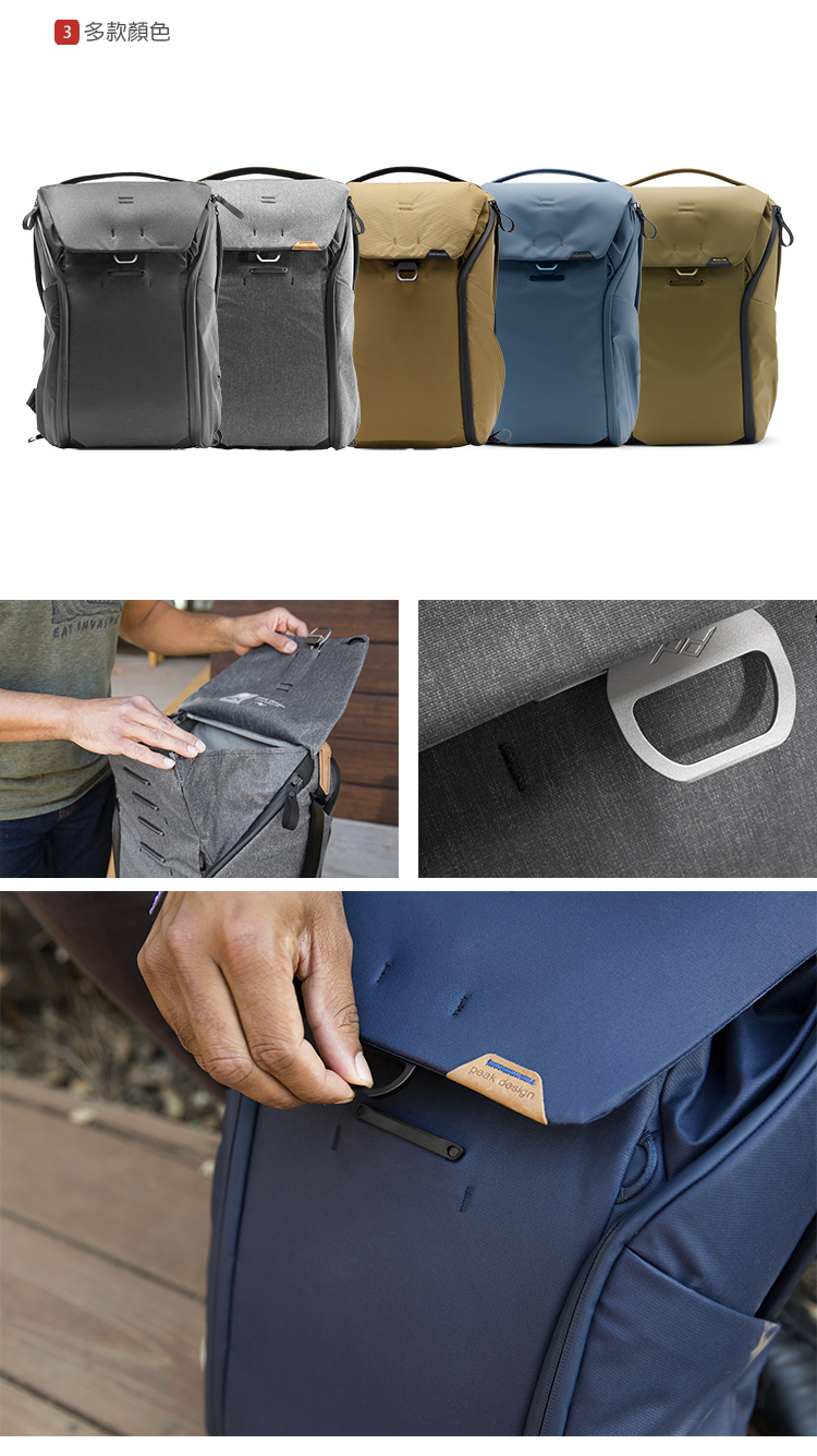 精簡輪廓設計。減少明顯的接縫,避免讓水或污物滲入背包,材質為100%可回收的400D尼龍,增強防潑水功能,與Zoom公司合作開發了專有的UltraZip新型拉鍊,側邊內置三腳架綁帶設計,也可任意調整筆記型電腦隔層高度 ,依然完美搭配Capture 相機快夾系統 。