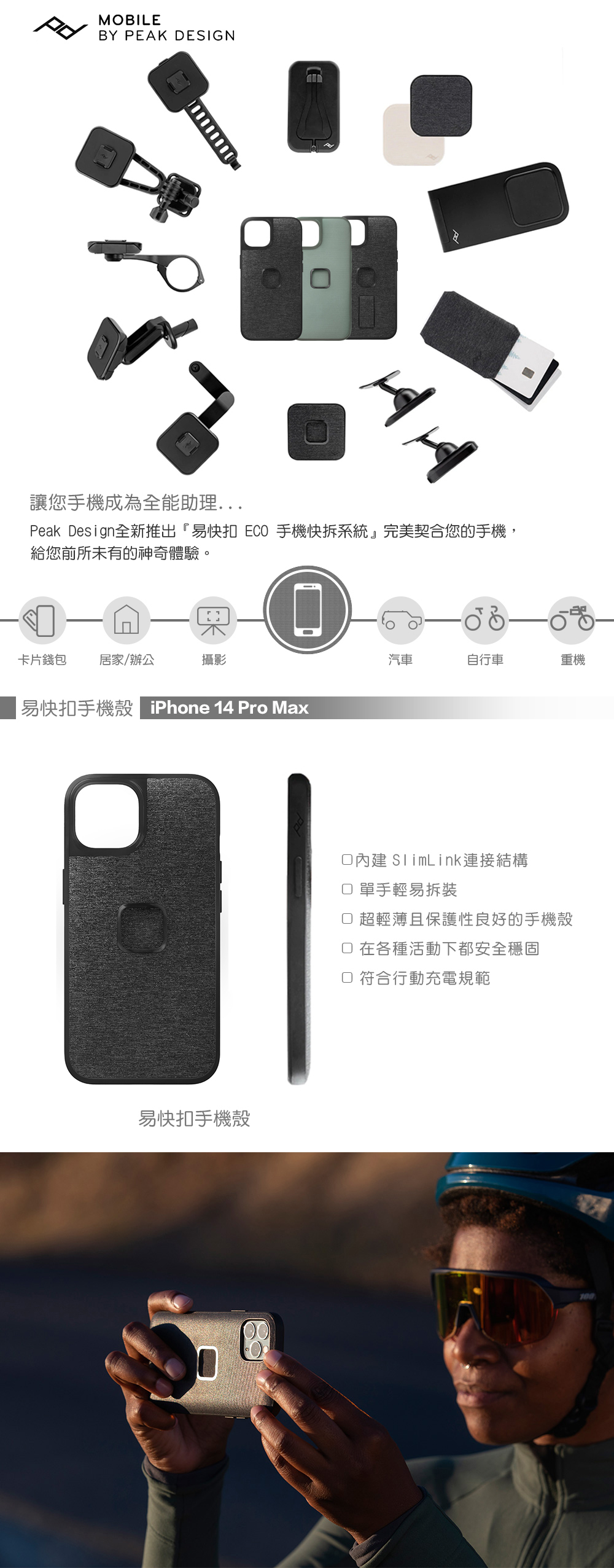 內建專利SlimLink連接結構、單手輕易拆裝、超輕薄且保護性良好的手機殼、在各種活動下都安全穩固、符合行動充電規範、可搭配全套易快扣(ECO)相關配件使用。