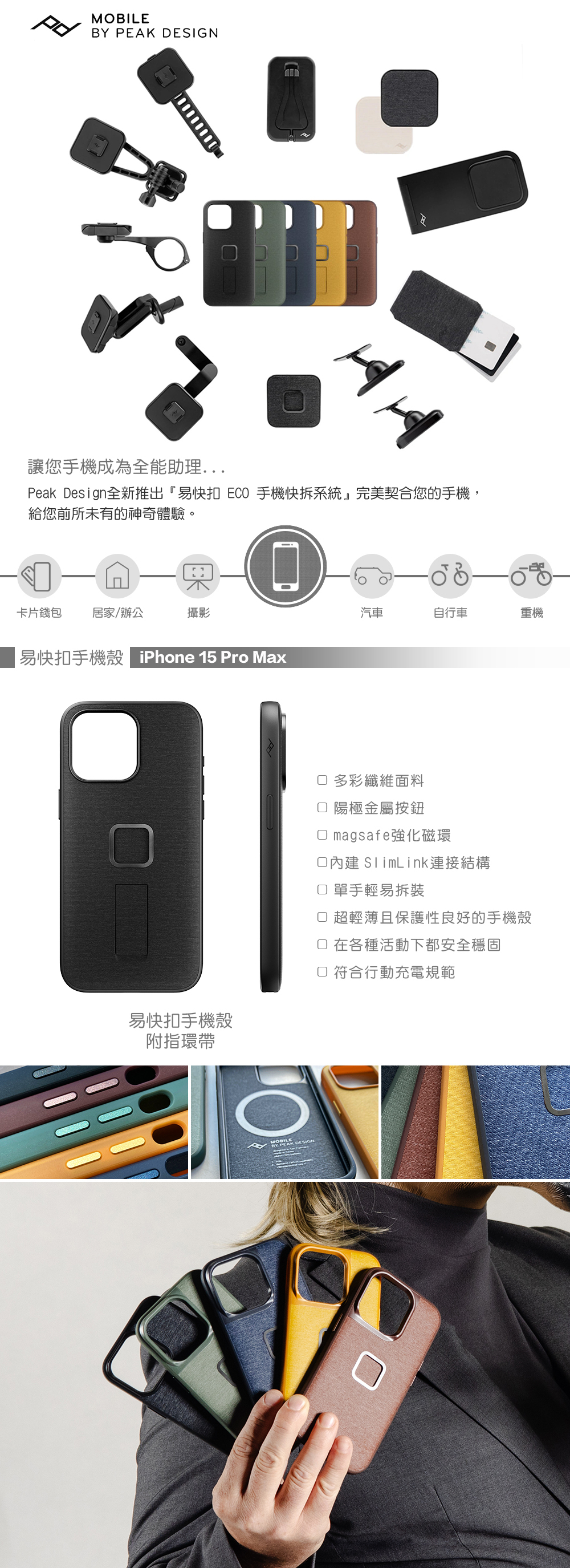 五色繽紛上市!多彩纖維面料、magsafe強化磁環、陽極金屬按鈕,內建專利SlimLink連接結構、單手輕易拆裝、超輕薄且保護性良好的手機殼、在各種活動下都安全穩固、符合行動充電規範、可搭配全套易快扣(ECO)相關配件使用。