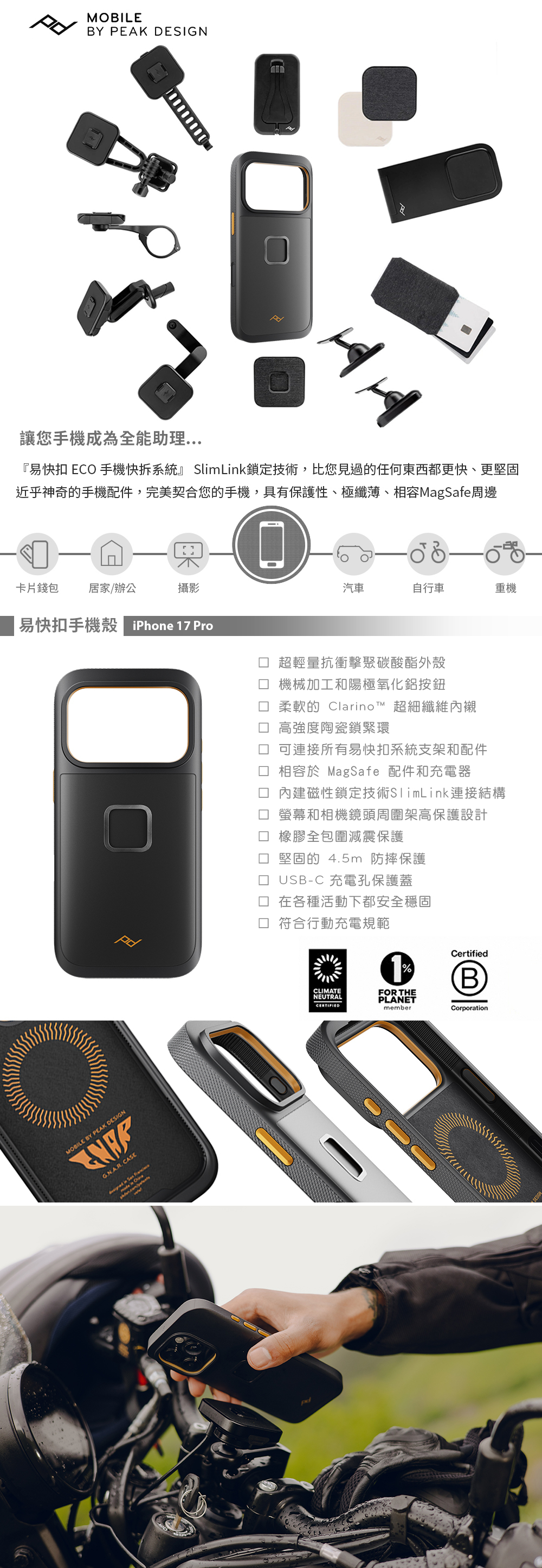 專利SlimLink連接結構、單手輕易拆裝,比您見過的都更快、更堅固的手機配件,螢幕和相機鏡頭周圍架高保護設計,橡膠全包圍減震,堅固的 4.5m 防摔保護,超輕薄且保護性良好的手機殼、在各種活動下都安全穩固,相容於 MagSafe 配件和充電器,可搭配全套易快扣(ECO)相關配件使用。