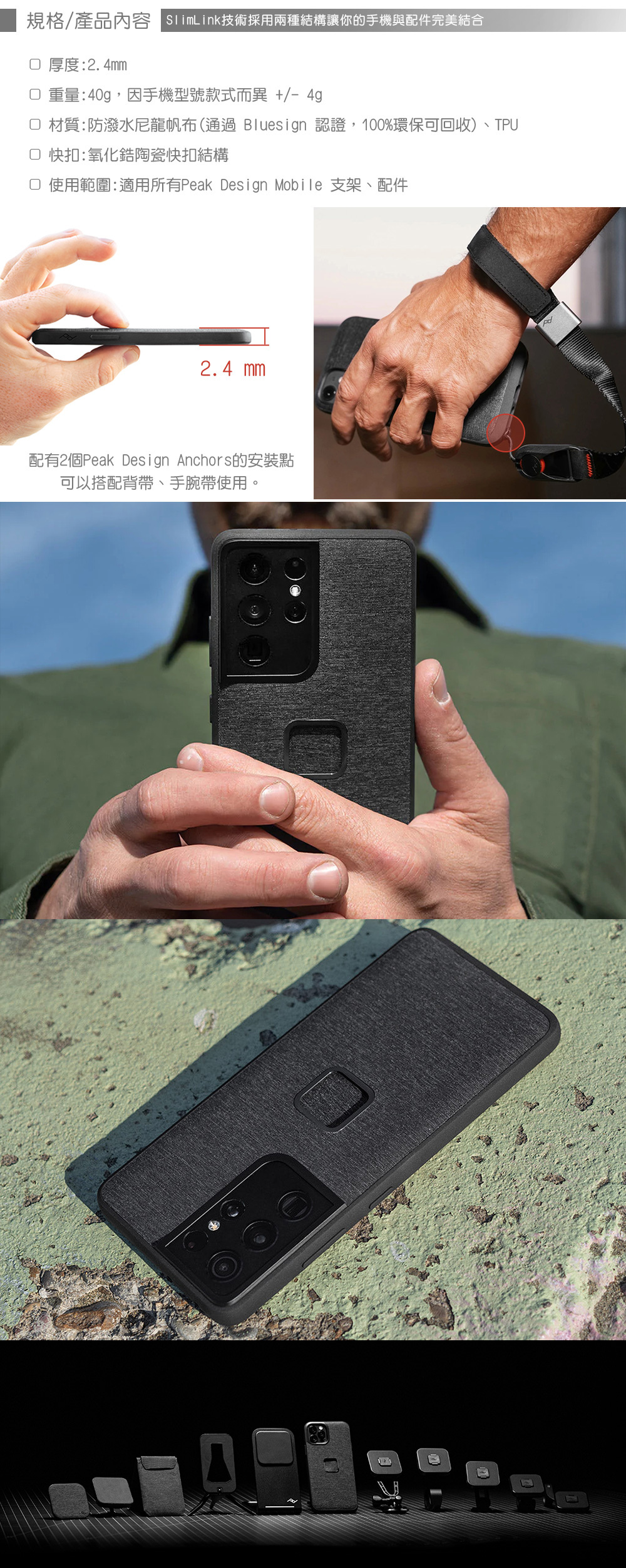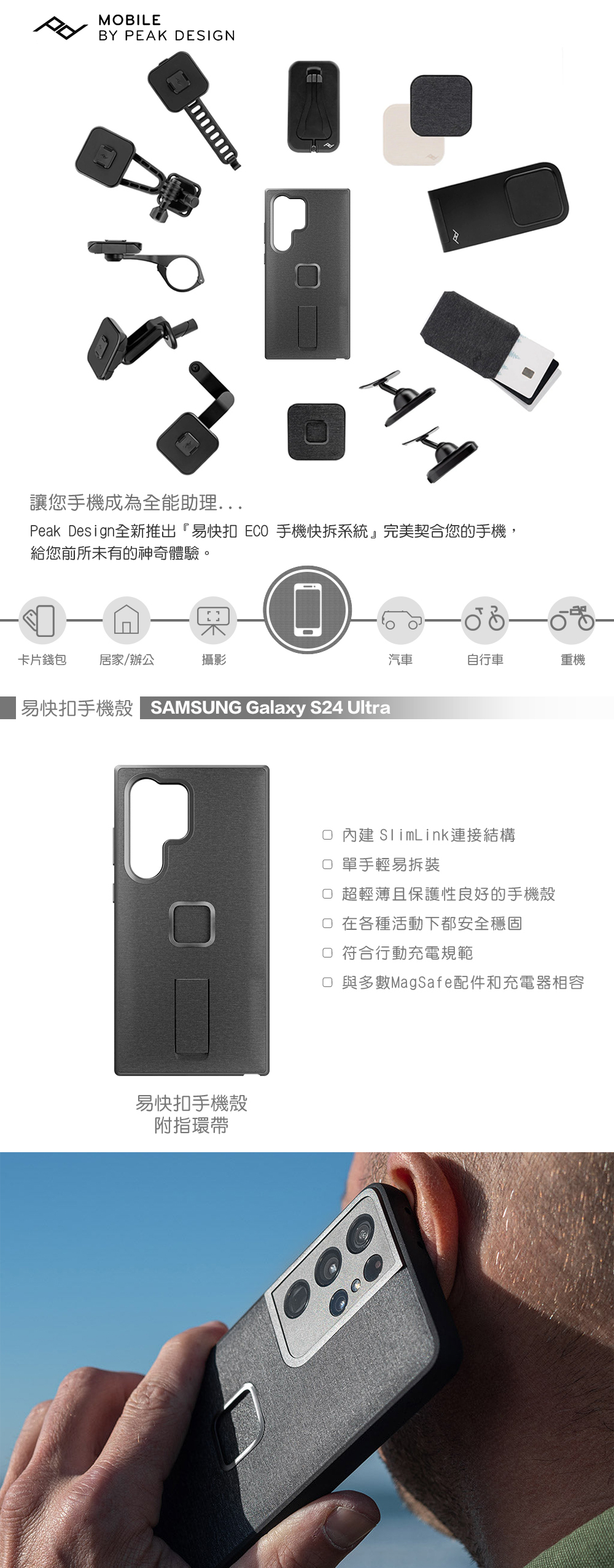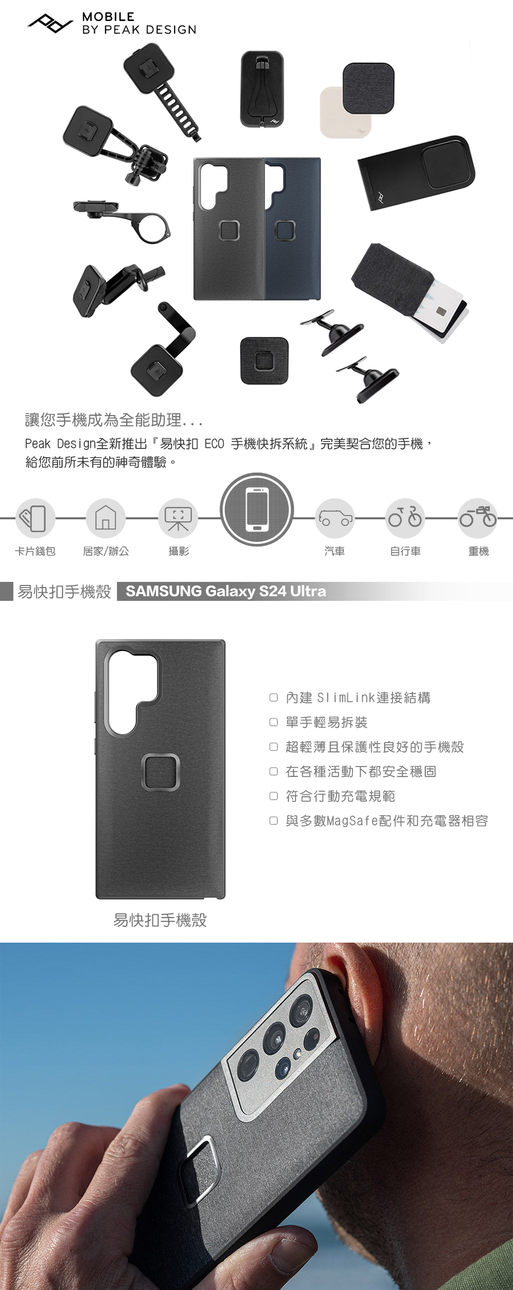 適用型號 : Samsung Galaxy S24 Ultra,內建專利SlimLink連接結構、單手輕易拆裝、超輕薄且保護性良好的手機殼、在各種活動下都安全穩固、符合行動充電規範、可搭配全套易快扣(ECO)相關配件使用。