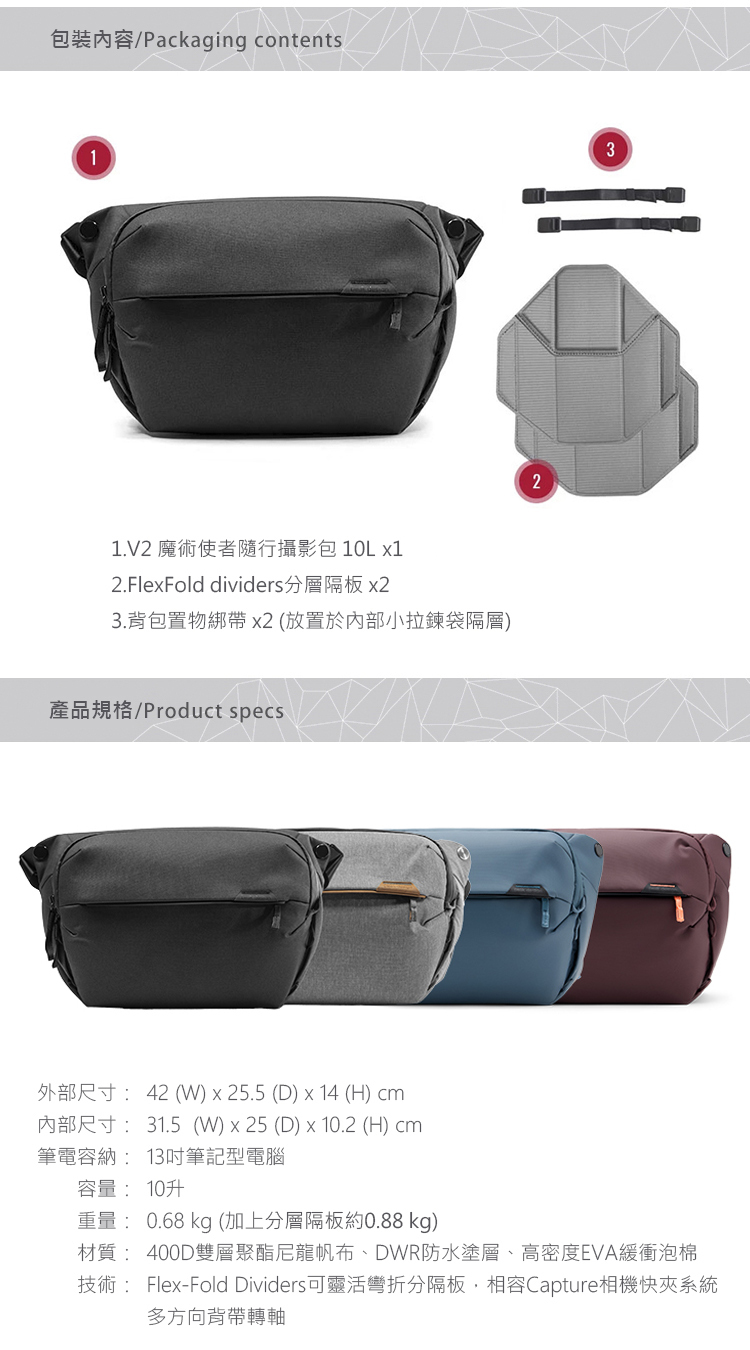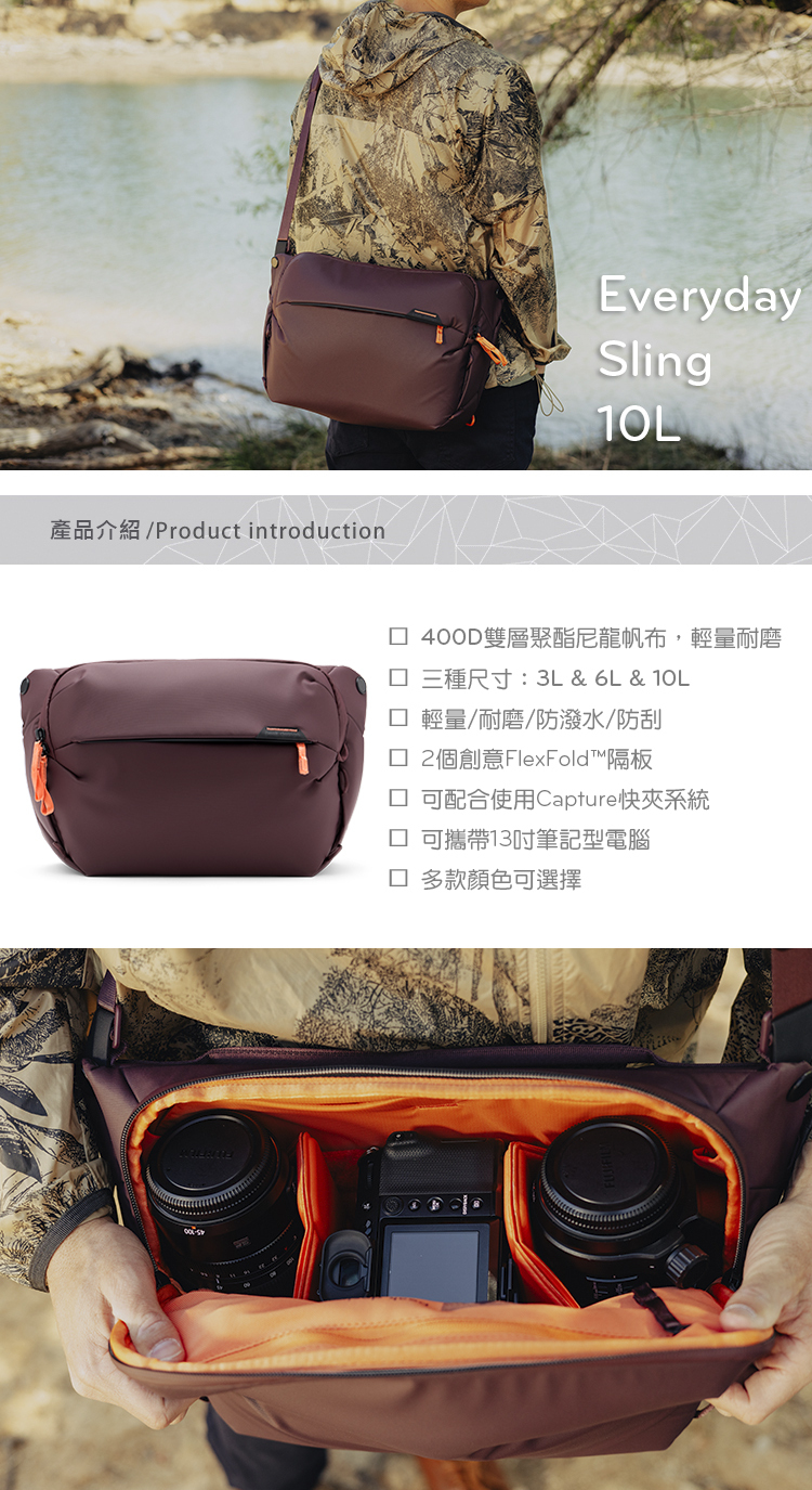 10L都會通勤.隨著攝影器材的小型輕量化,出門攜帶的東西也更為簡單,簡約的隨行包是輕裝出門的最佳選擇。體剪裁無縫設計,圓滑、時尚。使用更舒適、更耐用的背帶材質,10L款擁有13”筆電隔層。
