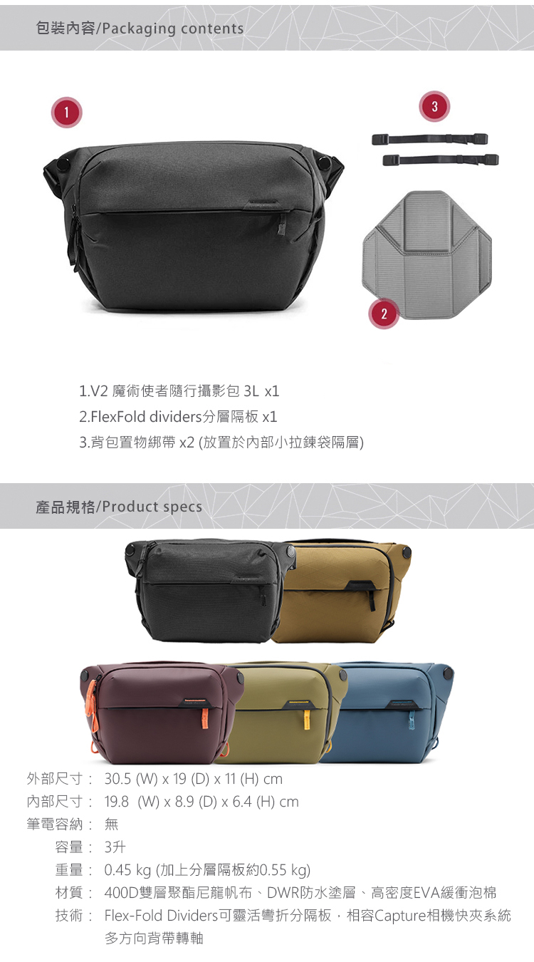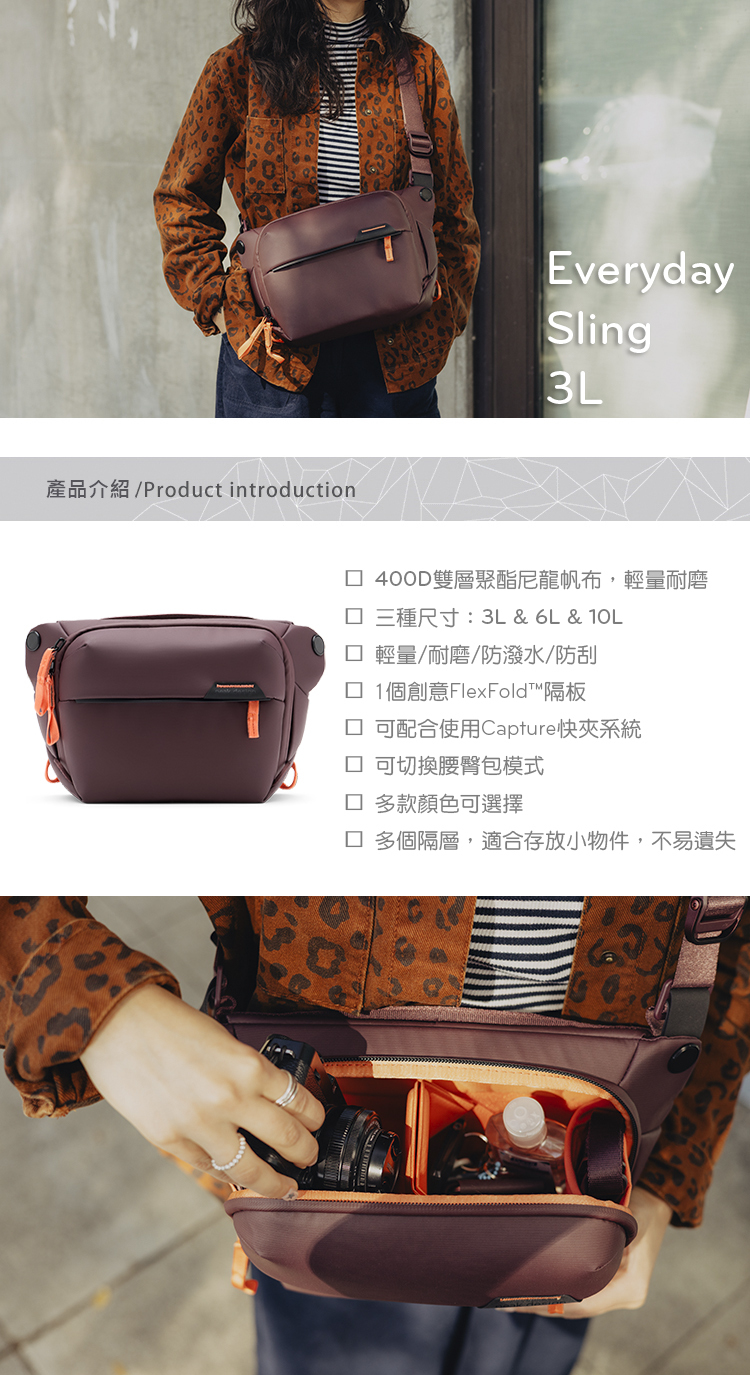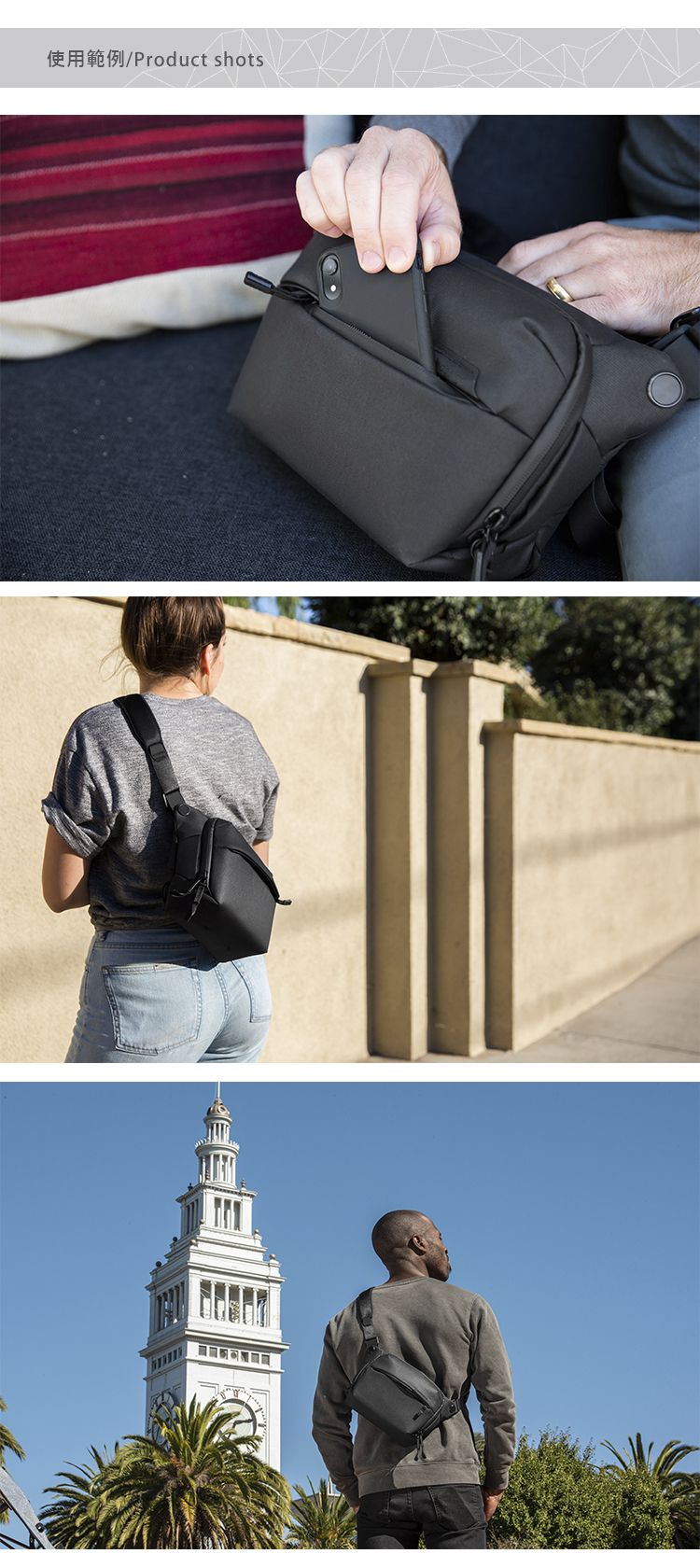3L日常隨行.隨著攝影器材的小型輕量化,出門攜帶的東西也更為簡單,簡約的隨行包是輕裝出門的最佳選擇。體剪裁無縫設計,圓滑、時尚。使用更舒適、更耐用的背帶材質,可切換腰臀包模式。