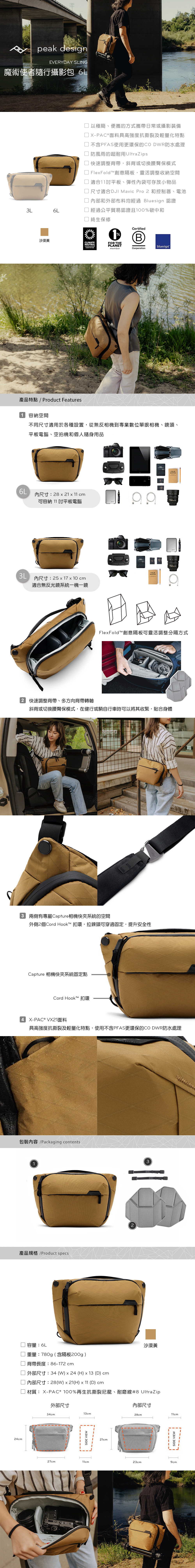 6L輕裝出行,採用時尚、防風雨的X-PAC®布料,具高強度抗撕裂及輕量化的特點。隨著攝影器材的小型輕量化,出門攜帶的東西也更為簡單,簡約的隨行包是輕裝出門的最佳選擇。體剪裁無縫設計,圓滑、時尚。使用更舒適、更耐用的背帶材質,可切換腰臀包模式。