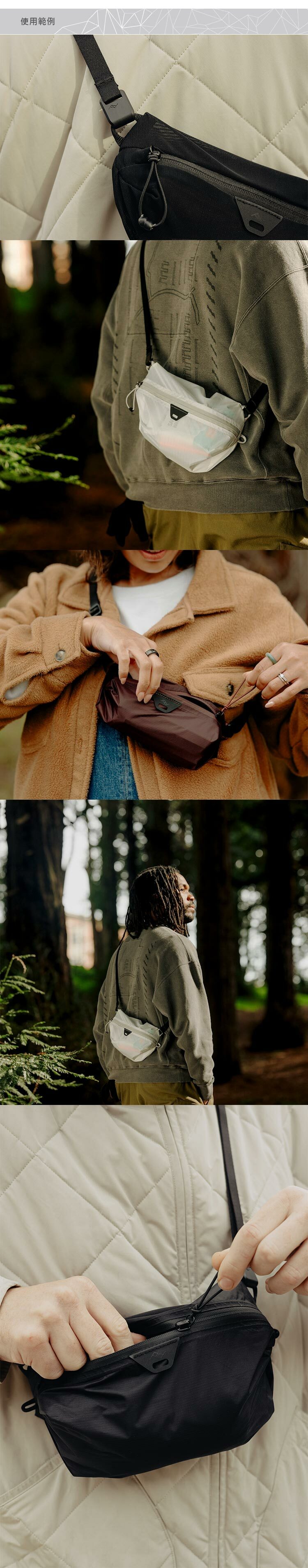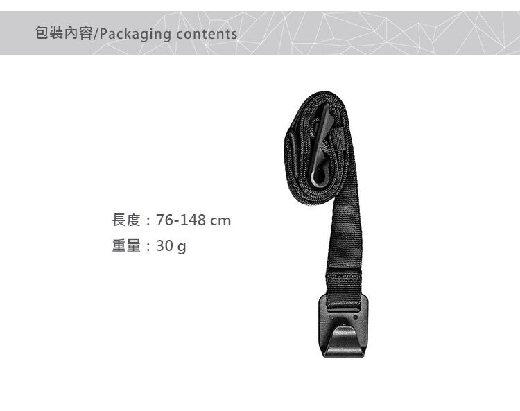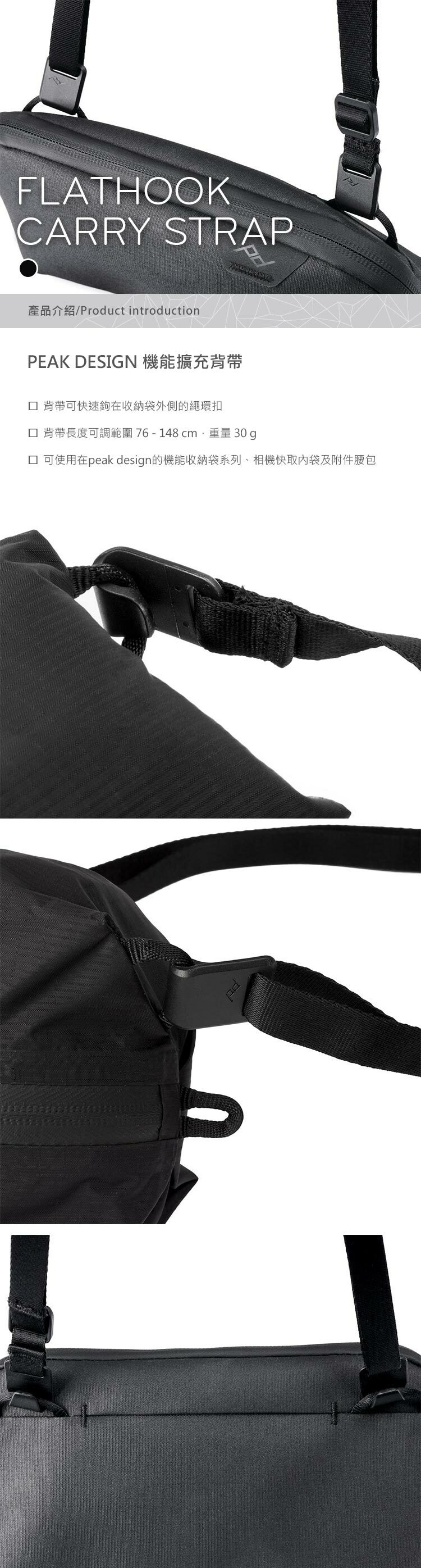 背帶可快速鉤在收納袋外側的繩環扣,可使用在peak design的機能收納袋系列、相機快取內袋及附件腰包,秒變輕便隨行包,完美相容。背帶長度可調範圍 76 - 148 cm,重量 30 g
