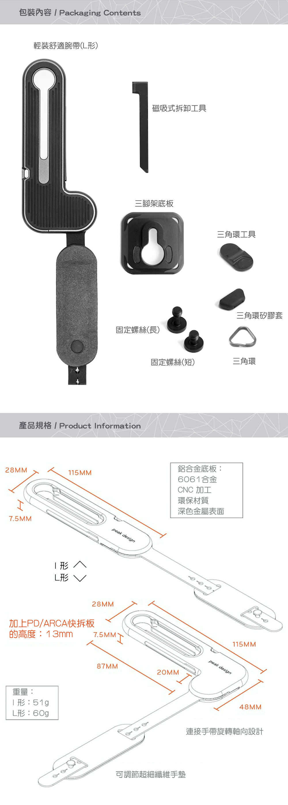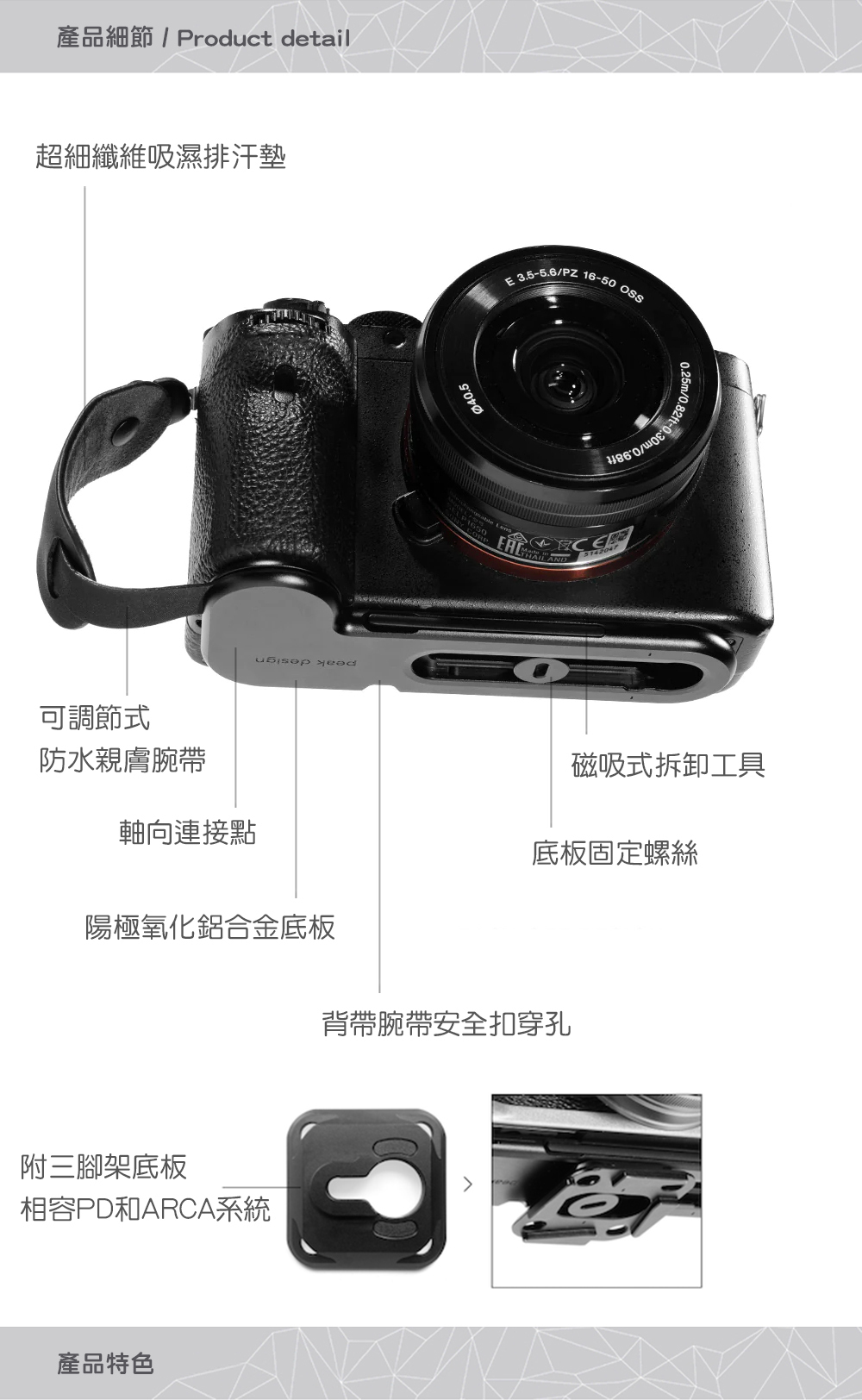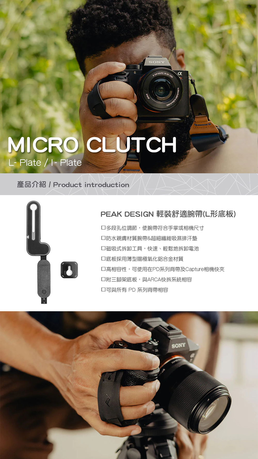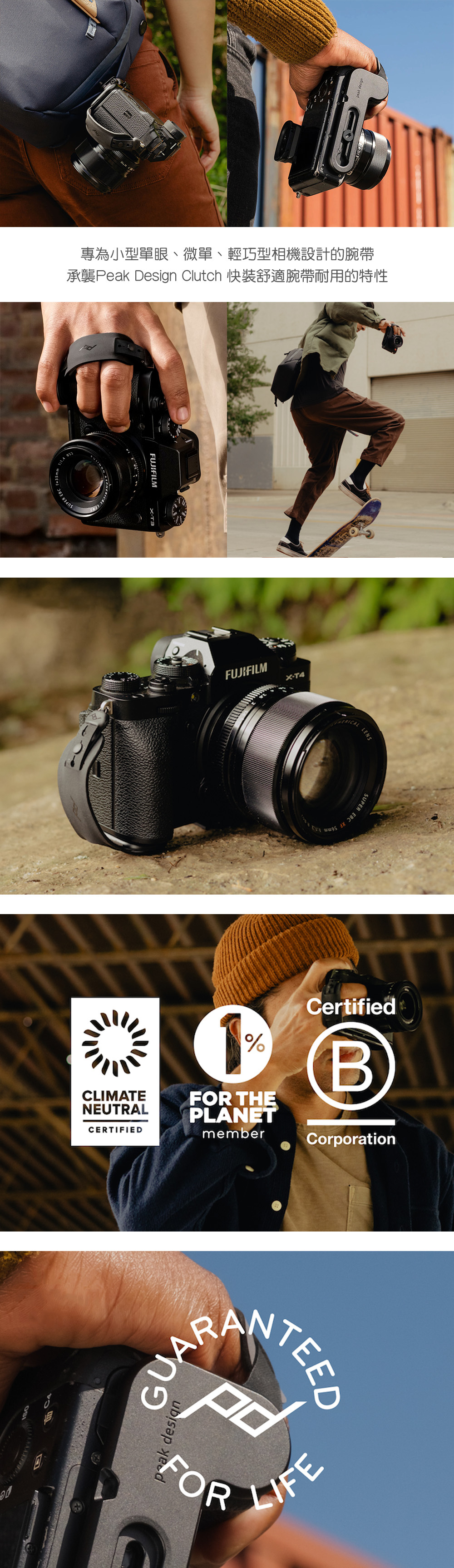 專為無把手的底片、小型單眼、微單、輕巧型相機設計的腕帶,承襲PeakDesign Clutch 腕帶舒適耐用的特性,且提供方便貼合的i型底板,環保再生材質製作,可長久使用,適合Sony,Fujifilm,Canon,Nikon,Leica,Ricoh系列使用,內有測試過的相機表格提供參考。