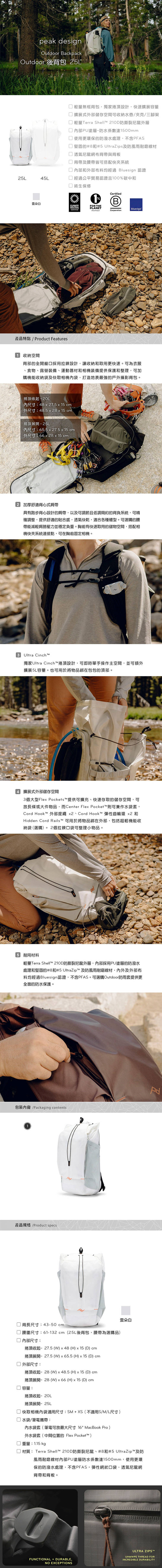 輕量無框架且超級舒適的日用背包,適合在步道上的探險或日常使用,具有跑步背心設計的肩帶,以及有可調節且低調的背負系統,可精確調整提供最大舒適度,適合各種體型,提供理想的貼合感。可選購的腰帶能減輕肩膀壓力並穩定負重。胸前有快速取用的儲物空間,搭配相機快夾系統連接點,可在胸前固定相機。獨家Ultra Cinch™捲頂設計,可即時單手操作主空間,並可額外擴展5L容量。也可用於將物品綁在包包的頂部。3個外部彈性收納袋提供可擴充、快速存取的儲存空間,可放長條或大件物品,背部的全開艙口採用拉鍊設計,讓收納和取用更快速。可為衣服、食物、露營裝備、運動器材和相機裝備提供保護和整理,可加購機能收納袋及快取相機內