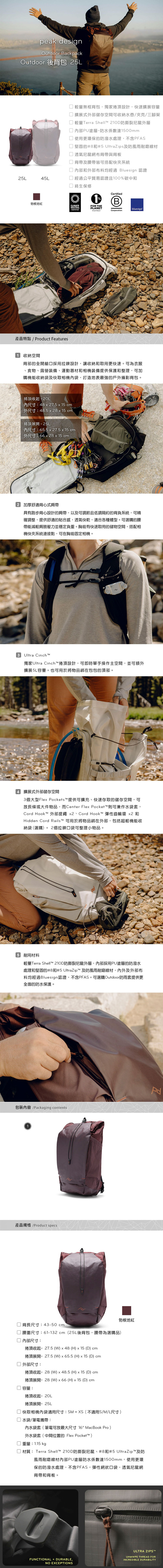 輕量無框架且超級舒適的日用背包,適合在步道上的探險或日常使用,具有跑步背心設計的肩帶,以及有可調節且低調的背負系統,可精確調整提供最大舒適度,適合各種體型,提供理想的貼合感。可選購的腰帶能減輕肩膀壓力並穩定負重。胸前有快速取用的儲物空間,搭配相機快夾系統連接點,可在胸前固定相機。獨家Ultra Cinch™捲頂設計,可即時單手操作主空間,並可額外擴展5L容量。也可用於將物品綁在包包的頂部。3個外部彈性收納袋提供可擴充、快速存取的儲存空間,可放長條或大件物品,背部的全開艙口採用拉鍊設計,讓收納和取用更快速。可為衣服、食物、露營裝備、運動器材和相機裝備提供保護和整理,可加購機能收納袋及快取相機內