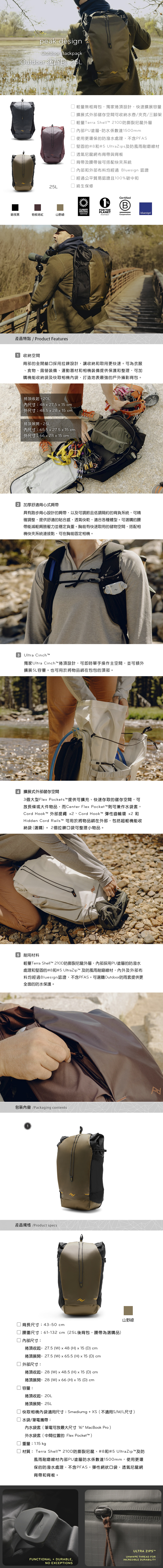 輕量無框架且超級舒適的日用背包,適合在步道上的探險或日常使用,具有跑步背心設計的肩帶,以及有可調節且低調的背負系統,可精確調整提供最大舒適度,適合各種體型,提供理想的貼合感。可選購的腰帶能減輕肩膀壓力並穩定負重。胸前有快速取用的儲物空間,搭配相機快夾系統連接點,可在胸前固定相機。獨家Ultra Cinch™捲頂設計,可即時單手操作主空間,並可額外擴展5L容量。也可用於將物品綁在包包的頂部。3個外部彈性收納袋提供可擴充、快速存取的儲存空間,可放長條或大件物品,背部的全開艙口採用拉鍊設計,讓收納和取用更快速。可為衣服、食物、露營裝備、運動器材和相機裝備提供保護和整理,可加購機能收納袋及快取相機內