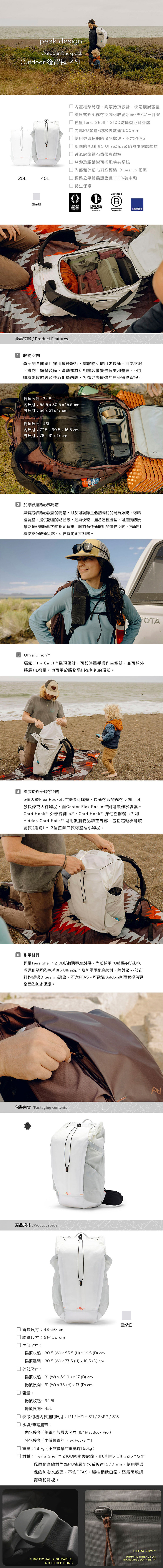 內置框架且超級舒適的戶外背包,適合攜帶大量裝備的戶外冒險,具有跑步背心設計的肩帶,以及可拆卸的腰帶,能減輕肩膀壓力並穩定負重。可調節背帶與背長設計,確保提供最大舒適度,適合各種體型,提供理想的貼合感。胸前有快速取用的儲物空間,搭配相機快夾系統連接點,可在胸前固定相機。獨家Ultra Cinch™捲頂設計,可即時單手操作主空間,並可額外擴展11L容量。也可用於將物品綁在包包的頂部。5個外部彈性收納袋提供可擴充、快速存取的儲存空間,可放長條或大件物品,背部的全開艙口採用拉鍊設計,讓收納和取用更快速。可為衣服、食物、露營裝備、運動器材和相機裝備提供保護和整理,可加購機能收納袋及快取相機內袋,打造地