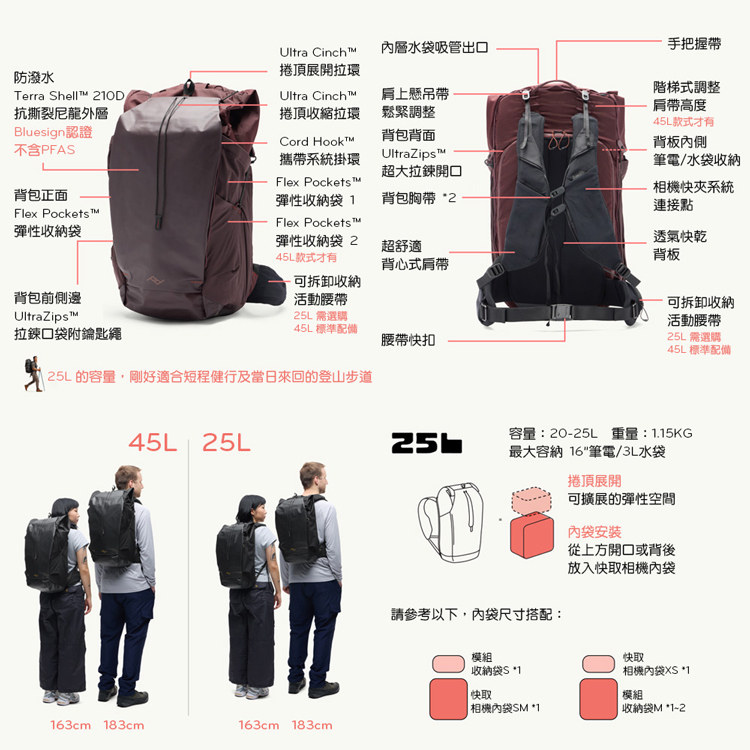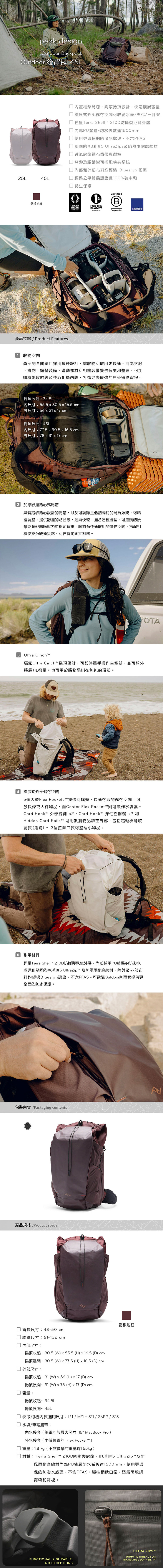 內置框架且超級舒適的戶外背包,適合攜帶大量裝備的戶外冒險,具有跑步背心設計的肩帶,以及可拆卸的腰帶,能減輕肩膀壓力並穩定負重。可調節背帶與背長設計,確保提供最大舒適度,適合各種體型,提供理想的貼合感。胸前有快速取用的儲物空間,搭配相機快夾系統連接點,可在胸前固定相機。獨家Ultra Cinch™捲頂設計,可即時單手操作主空間,並可額外擴展11L容量。也可用於將物品綁在包包的頂部。5個外部彈性收納袋提供可擴充、快速存取的儲存空間,可放長條或大件物品,背部的全開艙口採用拉鍊設計,讓收納和取用更快速。可為衣服、食物、露營裝備、運動器材和相機裝備提供保護和整理,可加購機能收納袋及快取相機內袋,打造地