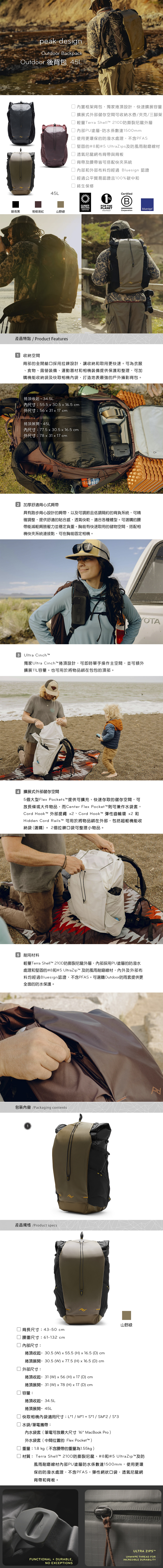 內置框架且超級舒適的戶外背包,適合攜帶大量裝備的戶外冒險,具有跑步背心設計的肩帶,以及可拆卸的腰帶,能減輕肩膀壓力並穩定負重。可調節背帶與背長設計,確保提供最大舒適度,適合各種體型,提供理想的貼合感。胸前有快速取用的儲物空間,搭配相機快夾系統連接點,可在胸前固定相機。獨家Ultra Cinch™捲頂設計,可即時單手操作主空間,並可額外擴展11L容量。也可用於將物品綁在包包的頂部。5個外部彈性收納袋提供可擴充、快速存取的儲存空間,可放長條或大件物品,背部的全開艙口採用拉鍊設計,讓收納和取用更快速。可為衣服、食物、露營裝備、運動器材和相機裝備提供保護和整理,可加購機能收納袋及快取相機內袋,打造地