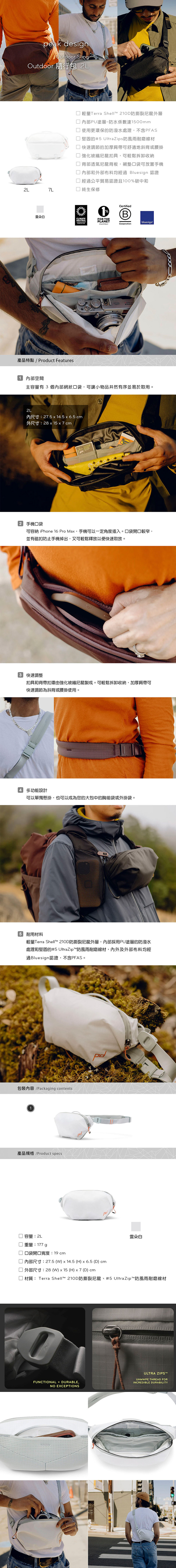 輕量 Terra Shell™ 210D 防撕裂尼龍外層,內部採用PU塗層、不含 PFAS 的防潑水處理和堅固的 #5 UltraZip™防風雨耐磨線材。簡約輕便適合作為萬用隨行包,當您需要快速輕便移動時,可讓您放心地將必需品整理、保護和收納。 可以單獨懸掛,也可以成為您的大包中的胸前袋或外掛袋。快速調節的加厚肩帶可舒適地斜背或腰掛,並搭配強化玻纖尼龍扣具,可輕鬆拆卸收納。背部的襯墊口袋,可放置手機,並帶有磁扣,內部還有2個網狀口袋,可存放小東西。經過公平貿易認證且 100% 碳中和。