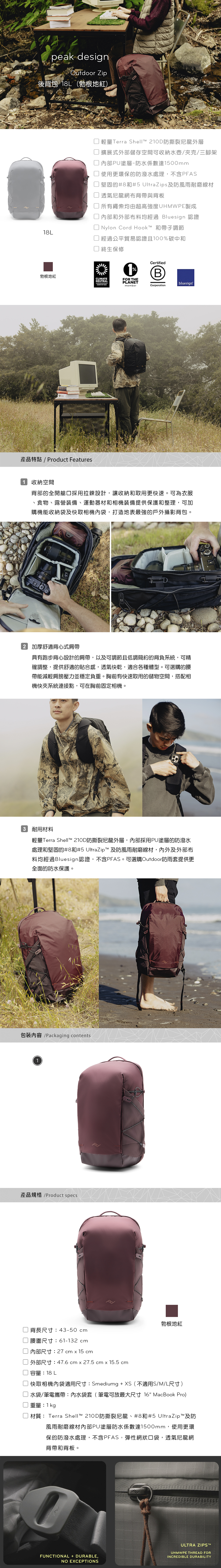 輕量無框架且超級舒適的日用背包,適合在步道上的探險或日常使用,具有跑步背心設計的肩帶,以及有可調節且低調的背負系統,可精確調整提供最大舒適度,適合各種體型,提供理想的貼合感。可選購的腰帶能減輕肩膀壓力並穩定負重。胸前有快速取用的儲物空間,搭配相機快夾系統連接點,可在胸前固定相機。獨家Ultra Cinch™捲頂設計,可即時單手操作主空間,並可額外擴展5L容量。3個外部彈性收納袋提供可擴充、快速存取的儲存空間,可放長條或大件物品,背部的全開艙口採用拉鍊設計,讓收納和取用更快速。可為衣服、食物、露營裝備、運動器材和相機裝備提供保護和整理,可加購機能收納袋及快取相機內袋,打造地表最強的戶外攝影背包