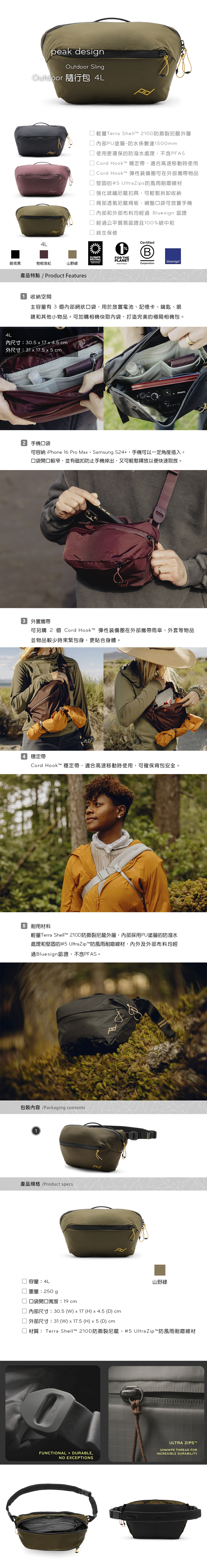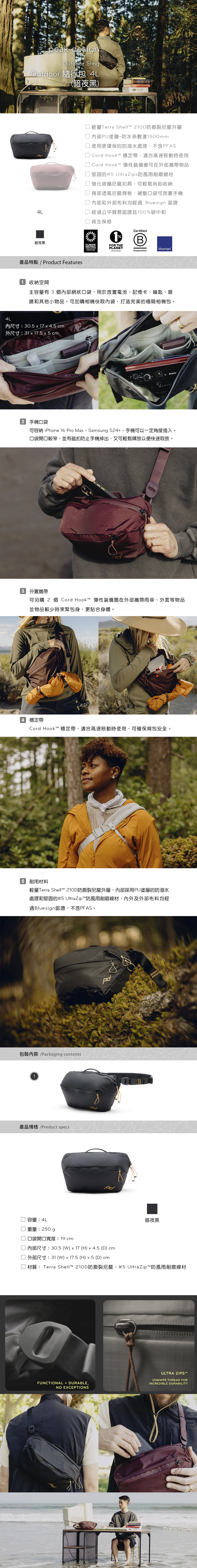 輕量 Terra Shell™ 210D 防撕裂尼龍外層,內部採用PU塗層、不含 PFAS 的防潑水處理和堅固的 #5 UltraZip™防風雨耐磨線材。使用 2 個 Cord Hook™ 彈性裝備圈在外部攜帶雨傘、外套或旅行三腳架等物品,並物品較少時束緊包身,更貼合身體。Cord Hook™ 穩定帶,適合高速移動時使用,可確保背包安全。搭配強化玻纖尼龍扣具,可輕鬆拆卸收納。可加購相機快取內袋,打造完美的極簡相機包。背部的襯墊口袋,可放置手機,並帶有磁扣,內部還有3個網狀口袋,可存放小東西。經過公平貿易認證且100%碳中和,終生保修。Outdoor隨行包 4L是介於2L跟7L之間的完美折中之選
