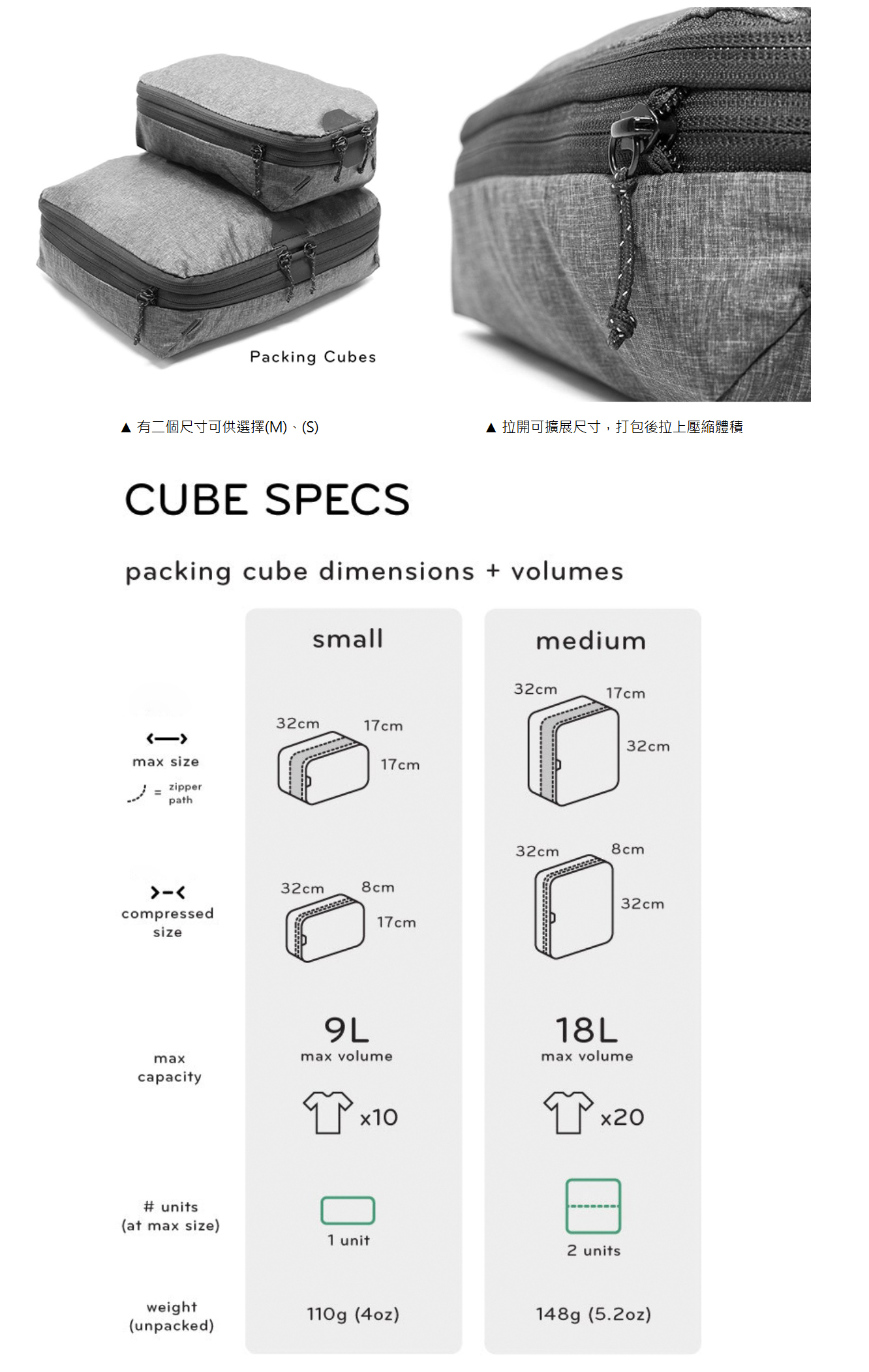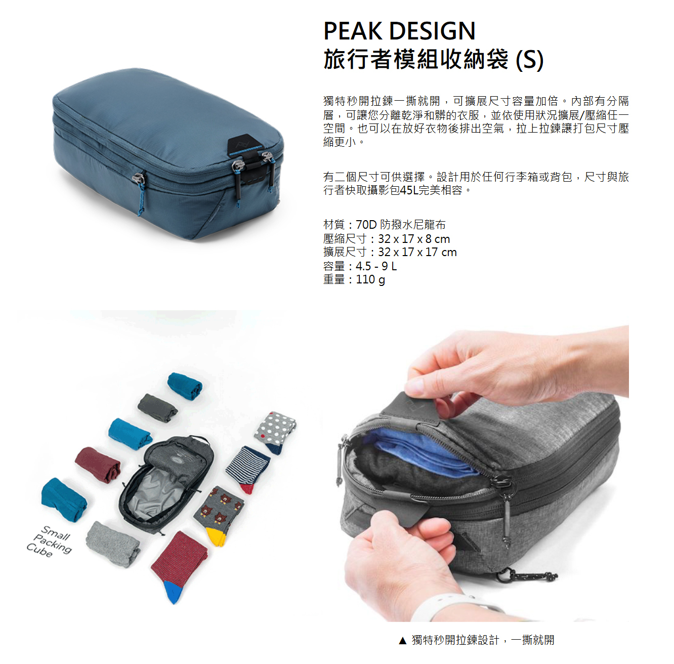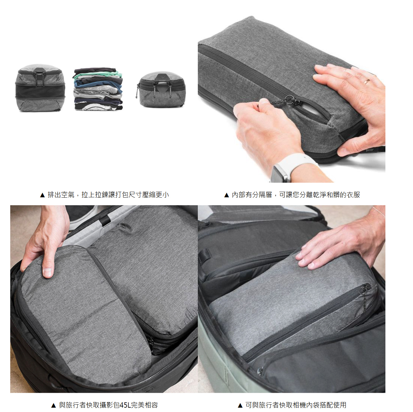 獨特秒開拉鍊一撕就開,可擴展尺寸容量加倍。內部有分隔層,可讓您分離乾淨和髒的衣服,並依使用狀況擴展/壓縮任一空間。也可以在放好衣物後排出空氣,拉上拉鍊讓打包尺寸壓縮更小。有二個尺寸可供選擇。設計用於任何行李箱或背包,尺寸與旅行者快取攝影包45L完美相容。