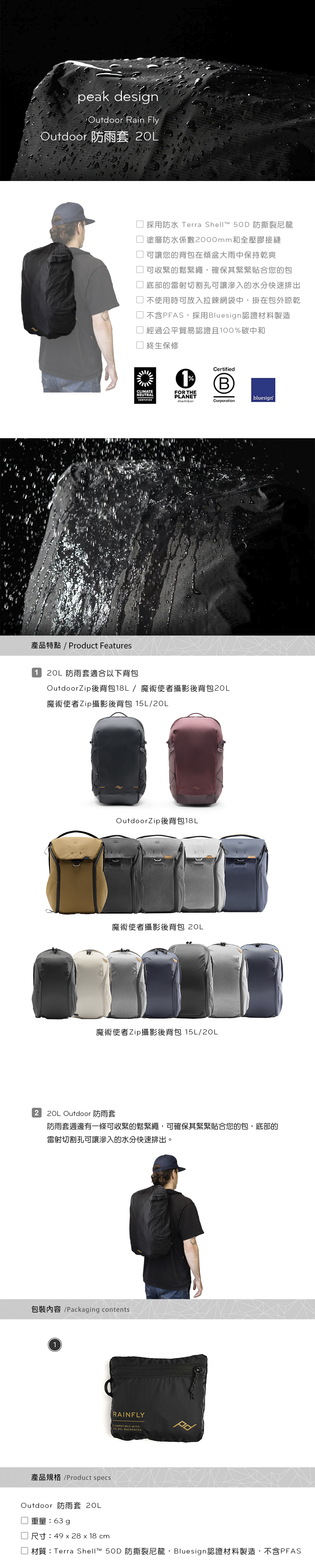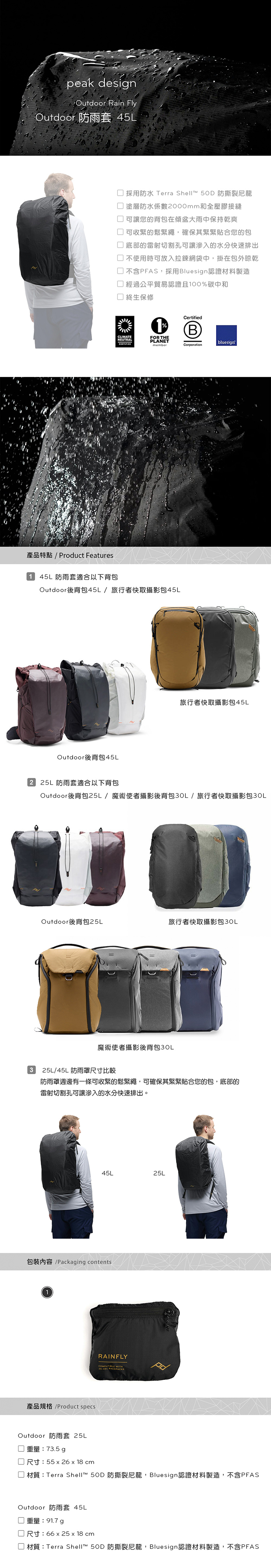 適用25L-45L背包,採用防水 Terra Shell™ 50D 防撕裂尼龍製成,塗層防水係數2000mm和全壓膠接縫,可讓您的背包在傾盆大雨中保持乾爽,全面保護免受惡劣天氣的影響。防雨罩週邊有一條可收緊的鬆緊繩,可確保其緊緊貼合您的包,底部的雷射切割孔可讓滲入的水分快速排出。不使用時,Outdoor Rain Fly 可放入可拉鍊網袋中,可掛在包外晾乾。布料經過 Bluesign 認證且不含 PFAS。經過公平貿易認證且 100% 碳中和。