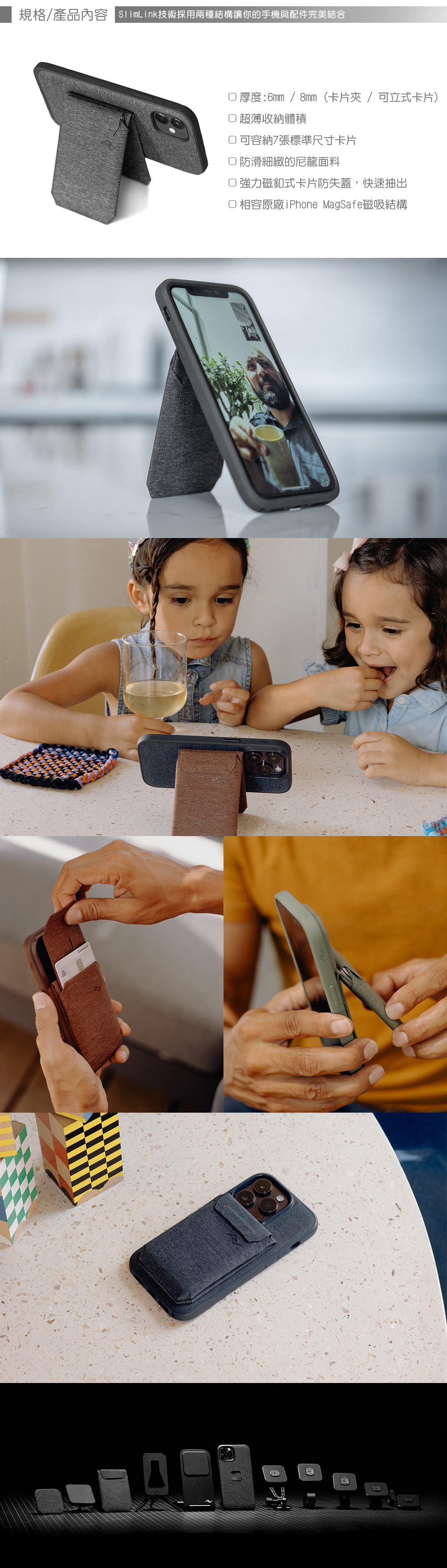 新增了更繽紛的色彩供您搭配手機展現個人風采,可立式卡片夾,能作為手機架使用,美觀細緻的防水尼龍材質,強力磁釦式卡片防失蓋,最多可容納7張卡片,相容原廠iPhone MagSafe磁吸結構。