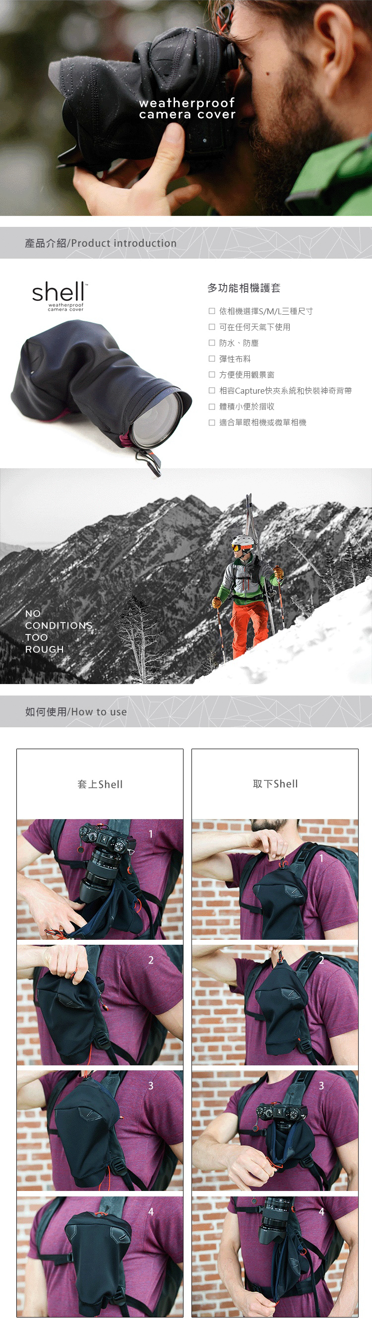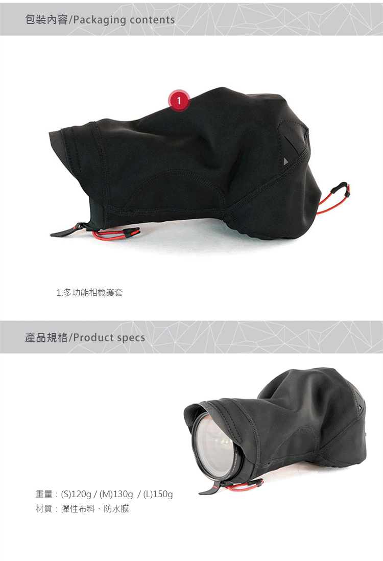 防雨、防塵,全片幅、旗艦DSLR搭配高階鏡頭都適用,防水、防塵還可防止機器磨損,水滴不易殘留,給相機緊密貼合保護,可手持、架三腳架上或在背包上都可使用。