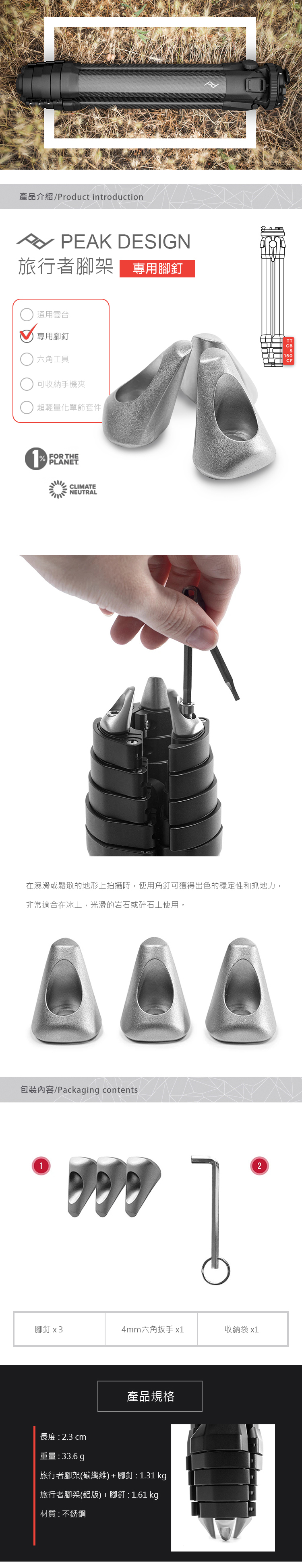 濕滑或鬆散的地形上拍攝時,使用角釘可獲得出色的穩定性和抓地力,非常適合在冰上,光滑的岩石或碎石上使用。
