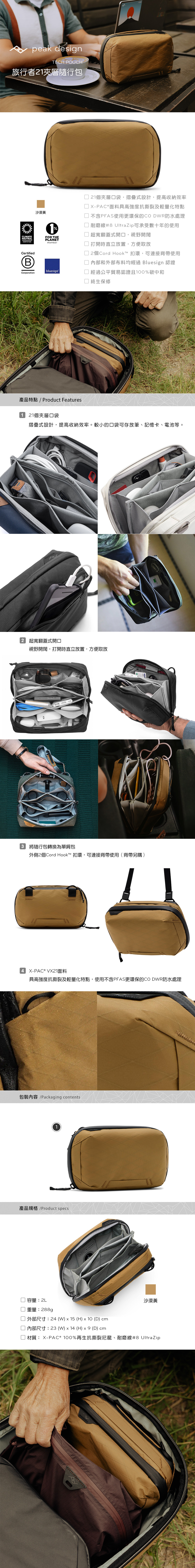 使用環保X-PAC®面料,具高強度抗撕裂及輕量化的特點。豐富的內袋設計,恰到好處的收納,無論是日常裝備還是旅行必需品,3C配件、傳輸線材、充電器、電池、讀卡機、行動電源等,都能解決您的收納需求。小巧好攜帶,摺疊式內袋提供了最佳的空間效率,讓您可縮小收納體積,同時保持物品整潔有序,易於取用。鬆緊環帶可以方便拿取文具、記憶卡和電池等物品。外部把手翻蓋式開口設計,可直接單手握持和使用。外部拉鍊袋有預留線材穿孔與內袋連結,便於設備充電。200D防潑水尼龍帆布外殼防風雨,美觀。
