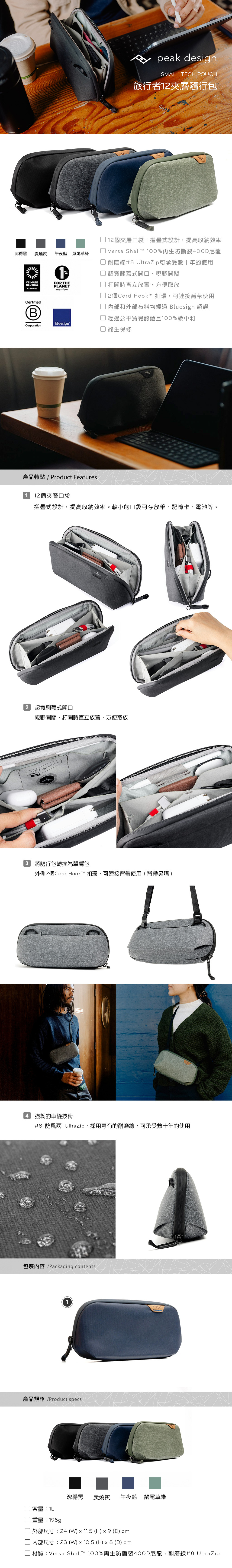 繼承了21夾層隨行包的設計、實用性和美觀性,並將其全部縮小到一半尺寸。12夾層隨行包體積小,可以塞進任何包的任何角落,但功能卻令人印象深刻,非常適合存放日常必需品,如電線、卡片、電池和充電器。內部採用 12 口袋設計,包括 4 個用於放置較大物品的大型摺疊式夾層、用於放置小物品的各種較小的彈性和拉鍊口袋以及一個筆環。由於專有的 Versa Shell™ 400D 外部面料和耐磨線 #8 UltraZip™,外部耐用且防風雨。包袋打開超寬,完全直立放置,以實現完全可視性和訪問。外部把手和角褶可以輕鬆地將袋子從狹窄的空間中拉出。 2 個 Cord Hook™ 扣環可讓您連接任何背帶(背帶另購),將