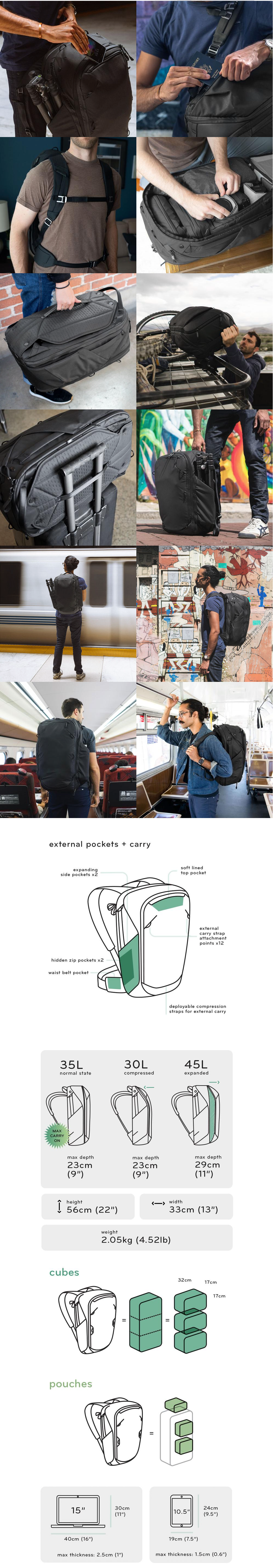 多功能,耐用,漂亮的隨身旅行背包,最大可擴展為45L重裝旅行或折收成35L日常背包並且符合國際航空隨身行李要求,頂部,側面,前面和後面開口都配備防風雨拉鍊。是一款多用途設計、著重細節、全方位實用的背包,與旅行者系列收納產品完美相容。每趟旅行可搭配各種不同收納模組,可以是相機包、行李包,陪你走遍世界各地。大量的內部和外部口袋,以及用拉鏈、網布分開的主空間。隱藏式背帶和腰帶,使用獨特的磁性卡扣,可在檢查行李時保持原位。360度手柄。巧妙地隱藏了外部的背帶。背包採用時尚、防風雨的100%再生400D尼龍帆布。