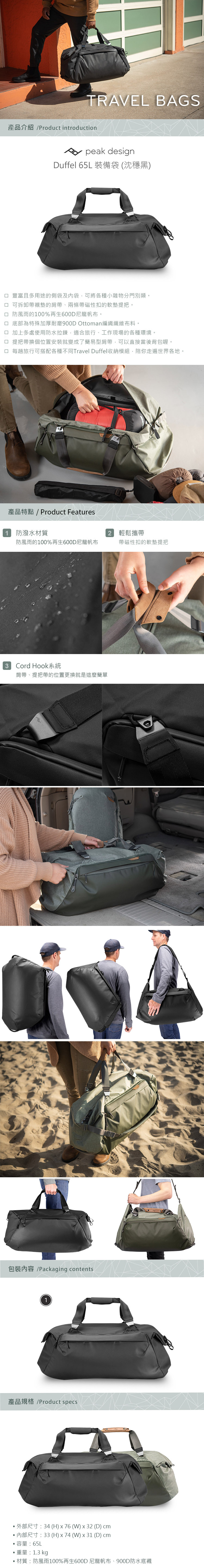 豐富且多用途的側袋及內袋,防風雨的100%再生600D尼龍帆布,加上多處使用防水拉鍊,適合旅行、工作現場的各種環境,集合功能性及耐用性的完美詮釋。作為旅遊時搭配後背包使用的額外行李包都想當適合,每趟旅行可搭配各種不同Travel Duffel收納模組,陪你走遍世界各地。