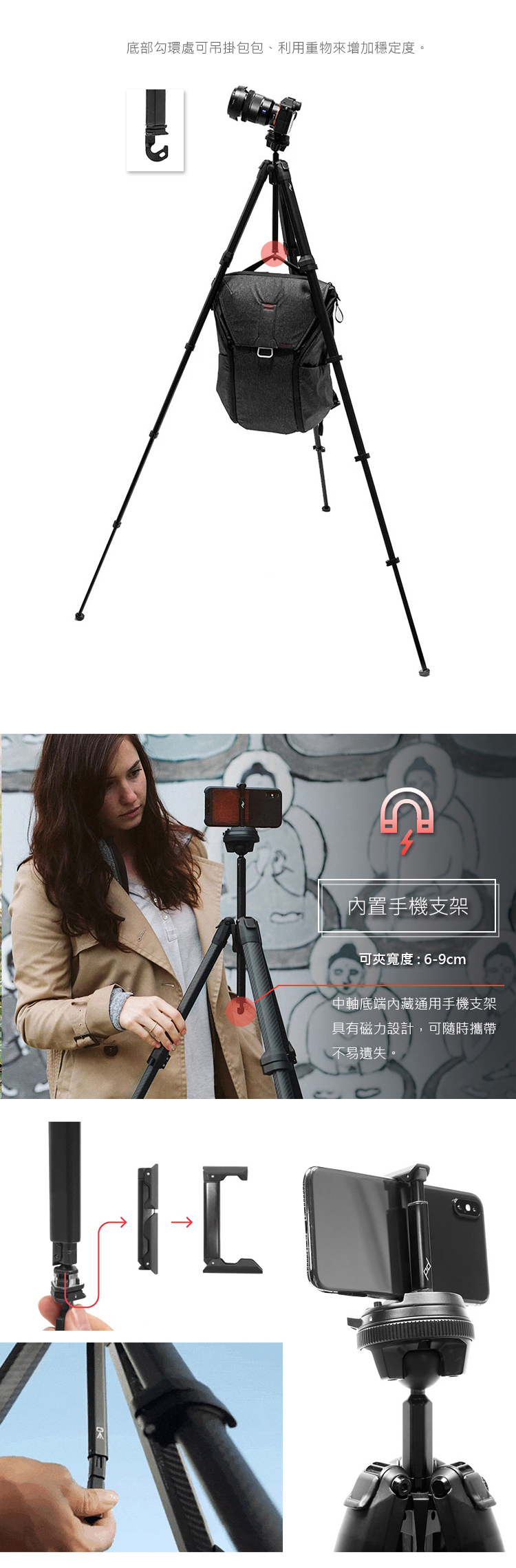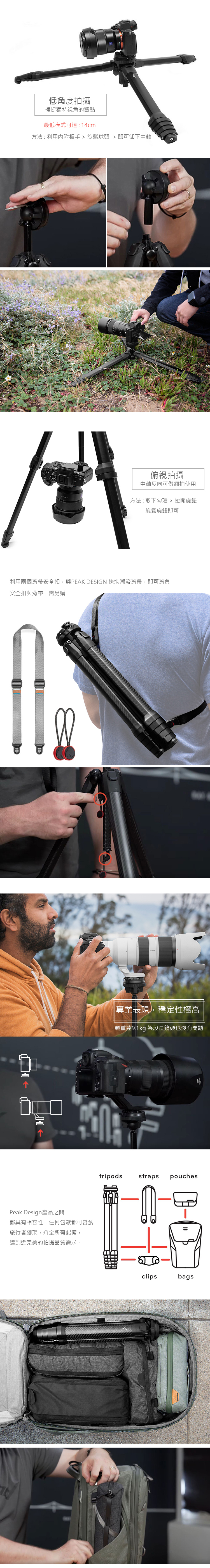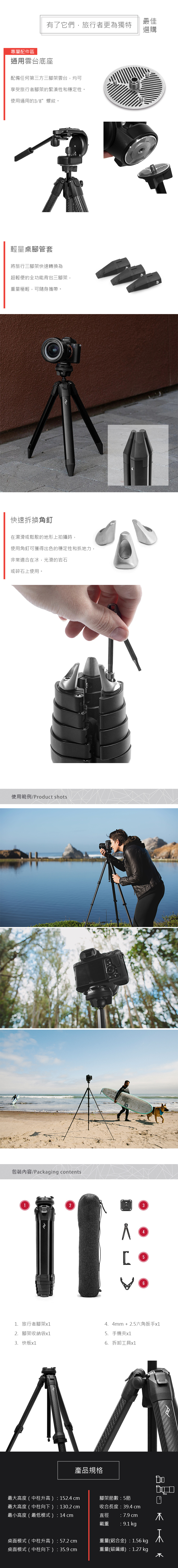 最適合旅行攜帶的腳架 ,最高高度:152.4 cm,載重:9.1 kg,自重:1.56 kg,材質:鋁合金,腳架節數:5,最快速收折紀錄:9.4 秒,突破性的架構,獨特設計,快速架設,專業高水平的穩定性。搭配專屬配件,更加提升拍攝品質的需求。