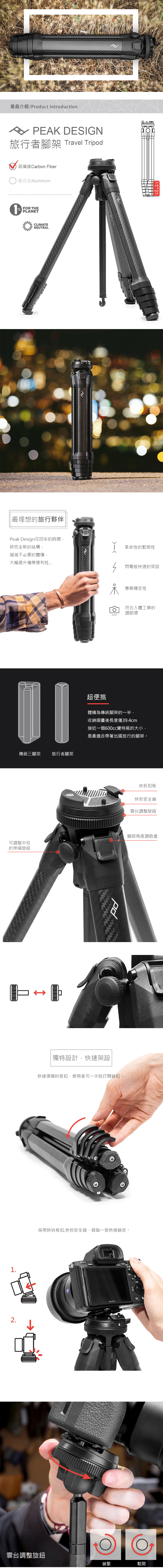 最適合旅行攜帶的腳架 ,最高高度:152.4 cm,載重:9.1 kg,自重:1.27 kg,材質:碳纖維腳管、鋁合金,腳架節數:5,最快速收折紀錄:9.4 秒,突破性的架構,獨特設計,快速架設,專業高水平的穩定性。搭配專屬配件,更加提升拍攝品質的需求。