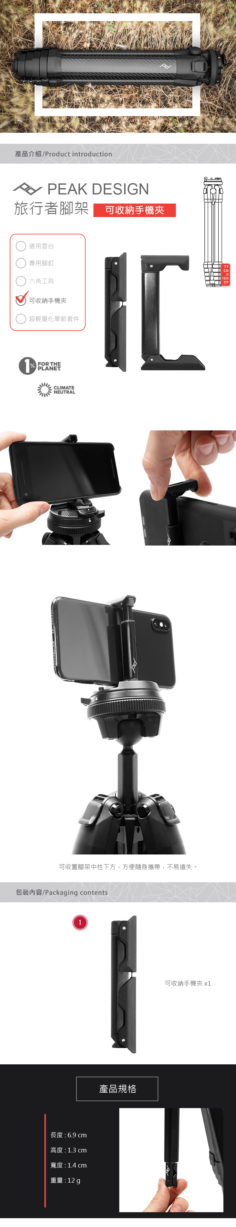 最大可夾88mm寬的手機,腳架專用手機夾,利用腳架中柱與手機夾,可作為自拍杆使用。