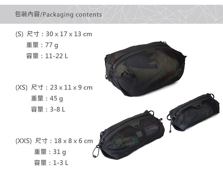 全尺寸三件組,微透尼龍彈性網布,觸感柔軟有彈性,網狀材質讓您快速辨識內容。四向彈性尼龍,可拉伸擴展雙倍容量。極縝密網布,透氣不悶臭,透氣尼龍網可讓濕氣散出,避免發黴,非常適合濕衣服或裝備。可選購機能擴充背帶,秒變輕便隨行包。可外掛於背包織帶,可捲曲收納隨身攜帶,多款顏色尺寸。材質符合Bluesign認證,符合生態環保、健康,讓消費者使用安全的保障。