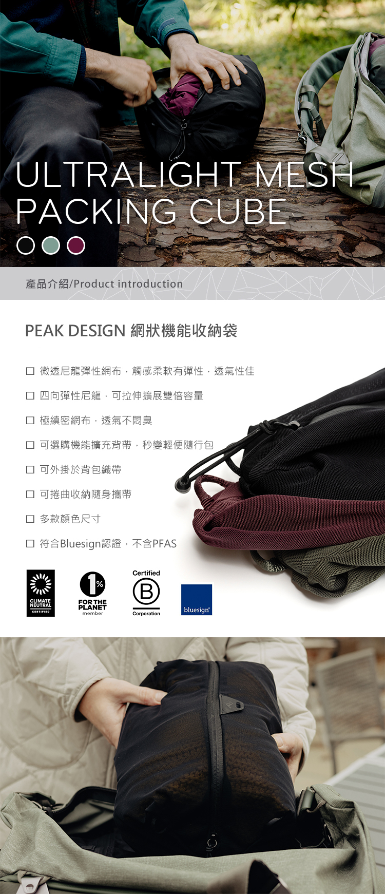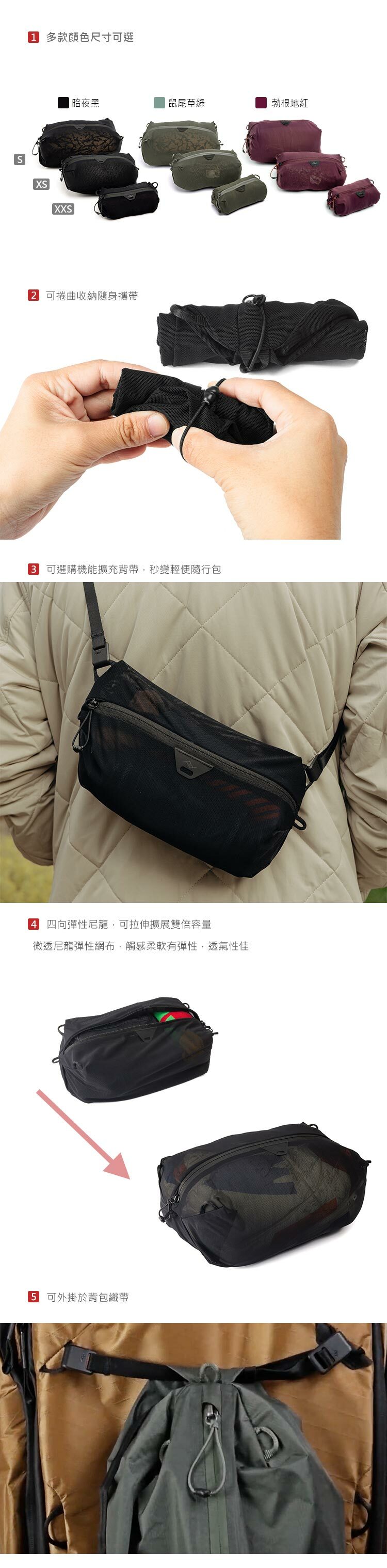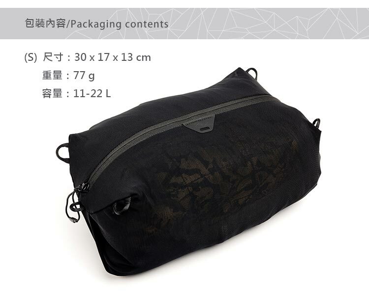 容量11-22L,微透尼龍彈性網布,觸感柔軟有彈性,網狀材質讓您快速辨識內容。四向彈性尼龍,可拉伸擴展雙倍容量。極縝密網布,透氣不悶臭,透氣尼龍網可讓濕氣散出,避免發黴,非常適合濕衣服或裝備。可選購機能擴充背帶,秒變輕便隨行包。可外掛於背包織帶,可捲曲收納隨身攜帶,多款顏色尺寸。材質符合Bluesign認證,符合生態環保、健康,讓消費者使用安全的保障。