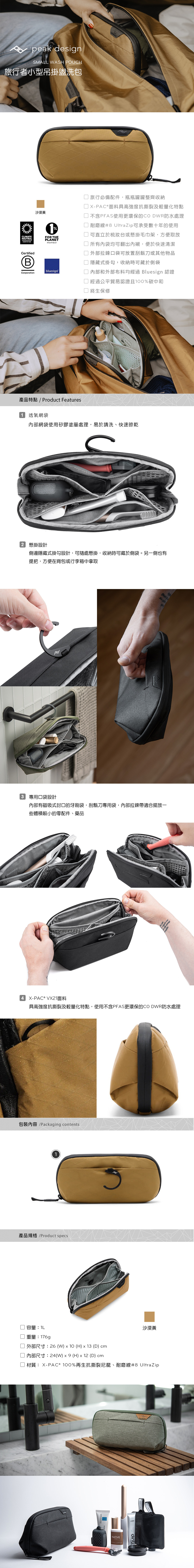 使用環保X-PAC®面料,具高強度抗撕裂及輕量化的特點。小型盥洗包採用與原尺寸相同的獨特材料和功能,但口袋更少,體積更薄,可存放在任何地方。防潑水材質以及高密度防水拉鍊,有網袋小隔層收納瓶瓶罐罐,中間長型隔層可獨立放置牙刷,打開時能穩固站立不會傾倒,也可搭配掛勾使用掛在任何你想要的地方,防潑水材質,內袋外袋都容易清理清洗。可以是盥洗包、工具包或、化妝包或是雜物收納袋,小巧輕便好攜帶,一包通通搞定,旅行必備好夥伴。